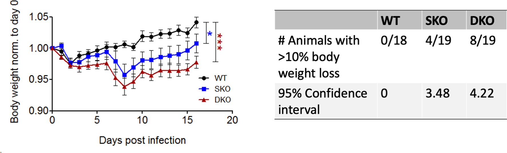 MDA5 KO and RIG-I/MDA5 DKO mice experience weight loss during rPICV infection. Body weight was measured daily for WT (n = 18), MDA5 SKO (n = 19) and DKO (n = 19) mice infected intraperitoneally (IP) with 1x105 PFU of WT rPICV. The data are representative of 4 independent experiments. The significance values are reported as the level of statistical significance experienced each day between 2 groups after day 6 of infection when mice began to show weight loss. The number of animals in each group that experienced significant weight loss (defined as >10%) as well as the 95% confidence intervals for the proportion of animals that experienced significant body weight loss are reported in the table. *p < 0.05, **p < 0.01, ***p < 0.001.