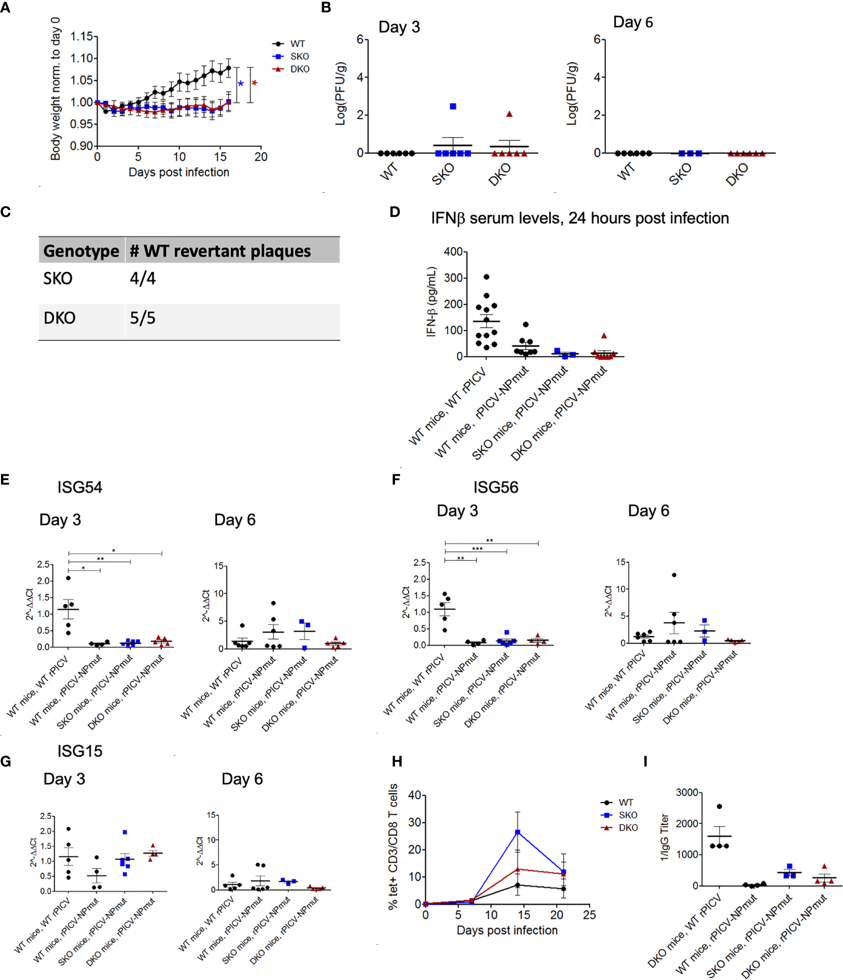 WT and KO mice robustly control rPICV-NPmut infection. (A) Body weight was measured daily for WT (n = 10), MDA5 SKO (n = 11) and RIG-I/MDA5 DKO (n = 11) mice infected intraperitoneally (IP) with 1x105 PFU of rPICV-NPmut virus. Statistical significance was observed in comparing WT to SKO and DKO between days 12 and 16 post infection. (B) rPICV-NPmut infectious viral titers were determined by plaque assay and are reported for spleen at days 3 and 6 following rPICV-NPmut infection. (C) Total RNAs were extracted from individual viral plaque from some of the virus-infected spleens and were sequenced to confirm the identity of the intended Alanine substitution at residue 380 of the PICV NP gene of the rPICV-NPmut and of the NP WT-revertant with the Asparagine at this position. (D) Sera were isolated from whole blood taken 24 h after rPICV-NPmut infection, and the IFN-ß expression levels in the sera were determined by ELISA and compared to the IFN-ß expression levels seen with the WT mice infected with the WT rPICV. (E–G) Total RNAs were extracted from spleens taken 3- and 6-days post rPICV-NPmut infection and were analyzed by RT-qPCR to determine the expression levels of the ISG54, ISG56 and ISG15. (H) The percentages (%) of CD8+ T cells that were also tetramer positive were reported at 7-day intervals (n = 4). (I) Sera were isolated from whole blood taken at day 21 post rPICV-NPmut, and the levels of anti-PICV NP antibody were determined by ELISA. *p < 0.05, **p < 0.01, ***p < 0.001.