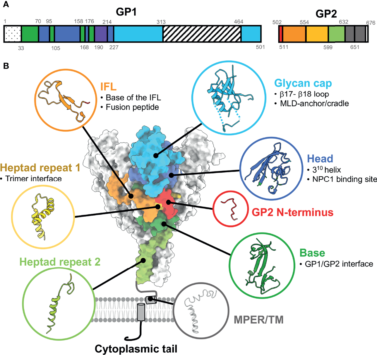 Ebolavirus GP functional and antigenic domain structure. (A) Full-length EBOV GP gene schematic indicating domains determined from structural analysis by color. Residues encompassing each domain are indicated by numbers. The 1-33 dotted domain is the non-structural signal peptide. Residues 313-464 are the mucin-like domain (MLD), which is disordered. The purple region from residues 190-214 represents the cathepsin cleavage loop, which hangs over the internal fusion loop (IFL) and is loosely ordered. (B) Surface rendering of EBOV GP (PDBID: 5JQ3) with corresponding domains shown in ribbon [based on numbering in part A, from Lee et al. (41)]. Antigenic sub-domains are indicated in bullet points. NPC1, Nieman Pick C1; MPER, membrane-proximal external region; TM, transmembrane domain. The structure of the MPER/TM is from PDBID: 5T42.