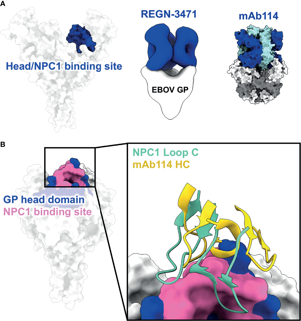 The head domain and NPC1 binding site. (A) The head domain on GP sits below the glycan cap. Antibody Fabs of REGN-3471 (left, blue, EMD: 7902) and mAb114 (right, HC in blue and LC in cyan, PDBID: 5FHC) from two FDA-approved EBOV therapeutics access the head domain through very steep angles. (B) The NPC1 binding site (pink) necessary for viral entry lies within the head domain (blue). NPC1 binds to this region through its Loop C domain (turquoise), which is partially mimicked and blocked by the CDR loops of mAb114 (yellow).