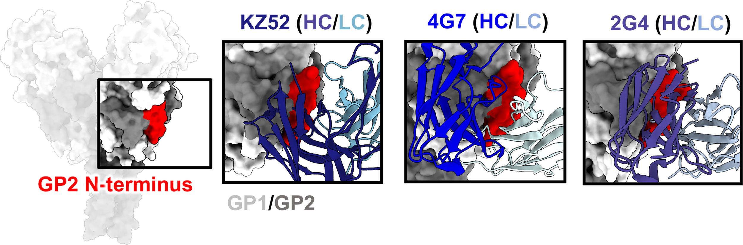 The GP2 N-terminus. The N-terminus of GP2 (red) lies at the interface of GP1 (light gray) and GP2 (dark gray), forming during viral spike processing after furin cleavage, generating GP1 and GP2. This region is a hotspot for neutralizing antibodies, such as KZ52 (left, PDBID: 3CSY), 4G7 (middle, PDBID: 5KEN), and 2G4 (right, PDBID: 5KEL) that access this region in nearly identical ways. A limitation for mAbs binding to this domain is that residues in this region are not well-conserved, and thus mAbs to this site are typically single-virus-species specific.