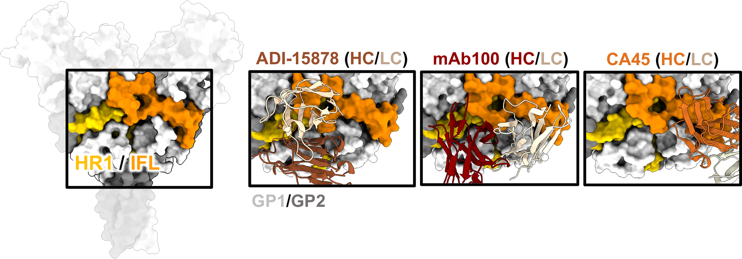 The IFL and HR1. The HR1 domain (yellow) and IFL (orange) form a belt around the middle of GP and antibodies that bind to this region often have overlapping contacts in both these regions. ADI-15878 (left, PDBID: 6DZL) uses a mechanism of induced-fit to mimic GP1 interactions with HR2 and simultaneously access conserved residues in the tip of the IFL. MAb100 (middle, PDBID: 5FHC) binds a very similar epitope to ADI-15878 but has a broader footprint and thus contacts several less-conserved residues making it monospecific. CA45 (right, PDBID: 6EAY) does not contact HR1, focusing more on the base of the IFL and has some broad activity.