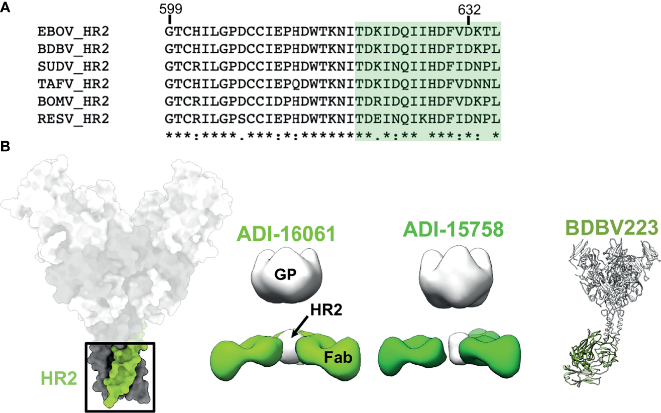 The HR2 domain. (B) The HR2 domain (far left in green) lies at the very base of GP, above the membrane proximal external regions that sit directly above the viral envelope and transmembrane domains. ADI-16061 (left, EMD-8698), ADI-15758 (middle, EMD-6588), and BDBV223 (right, composite of PDBID: 6N7J and PDBID: 5JQ3) bind to overlapping epitopes within the HR2 regions, which lies far below the base of GP. Negative stain EM for each of these antibodies indicates that three Fabs can bind simultaneously to a viral spike. (A) Sequence alignment of the HR2 region from all known ebolaviruses demonstrating the high level of sequence conservation in this region. The BDBV223 peptide is highlighted in green.