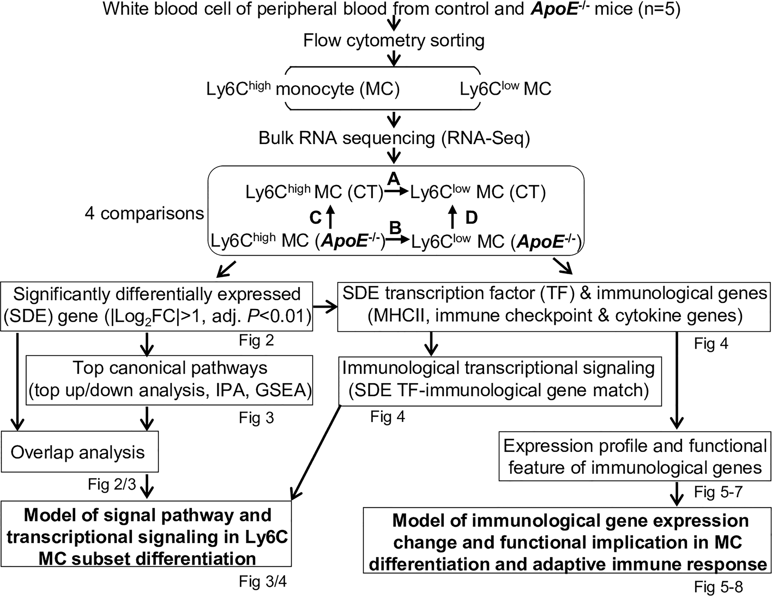 Overall strategy of the identification of molecular signaling in Ly6C MC subset differentiation and adaptive immune response in control and ApoE-/- mice. RNA-Seq were performed in Ly6Chigh (CD11b+Ly6G−Ly6Chigh) and Ly6Clow (CD11b+Ly6G−Ly6Clow) MC isolated by flow cytometry sorting from peripheral blood of C57/BL6 control and ApoE-/- mice. Transcriptome data were analyzed by performing four pairs of comparisons: (A) Ly6Chigh vs Ly6Clow (CT), (B) Ly6Chigh vs Ly6Clow (ApoE-/-), (C)ApoE-/- vs CT (Ly6Chigh), (D)ApoE-/- vs CT (Ly6Clow). SDE genes were identified by using the criteria of |Log2FC| more than 1 (2-FC) and adjusted P value less than 0.01. Top canonical pathways were recognized by top-down analysis using IPA with |Z-score|>2, P value<0.05. Overlapped analysis were performed for canonical pathways between groups. SDE TF and three sets of SDE immunological genes (MHCII, immune checkpoint and cytokine genes) were identified. Immunological SDE genes were matched with corresponding upstream SDE TF by IPA upstream analysis. Models of signal pathway and transcriptional signaling of Ly6C MC subset differentiation were developed. Expression profile and functional feature of immunological SDE genes were characterized. Model of immunological gene expression change and functional implication in MC differentiation and adaptive immune response in MC subsets of both mice were developed. CT, control, ApoE, Apolipoprotein E; FC, fold change; RNA-seq, RNA-sequencing; MC, monocyte; SDE, significant differentially expressed; IPA, Ingenuity Pathway Analysis; GSEA, gene set enrichment analysis; TF, transcription factor.