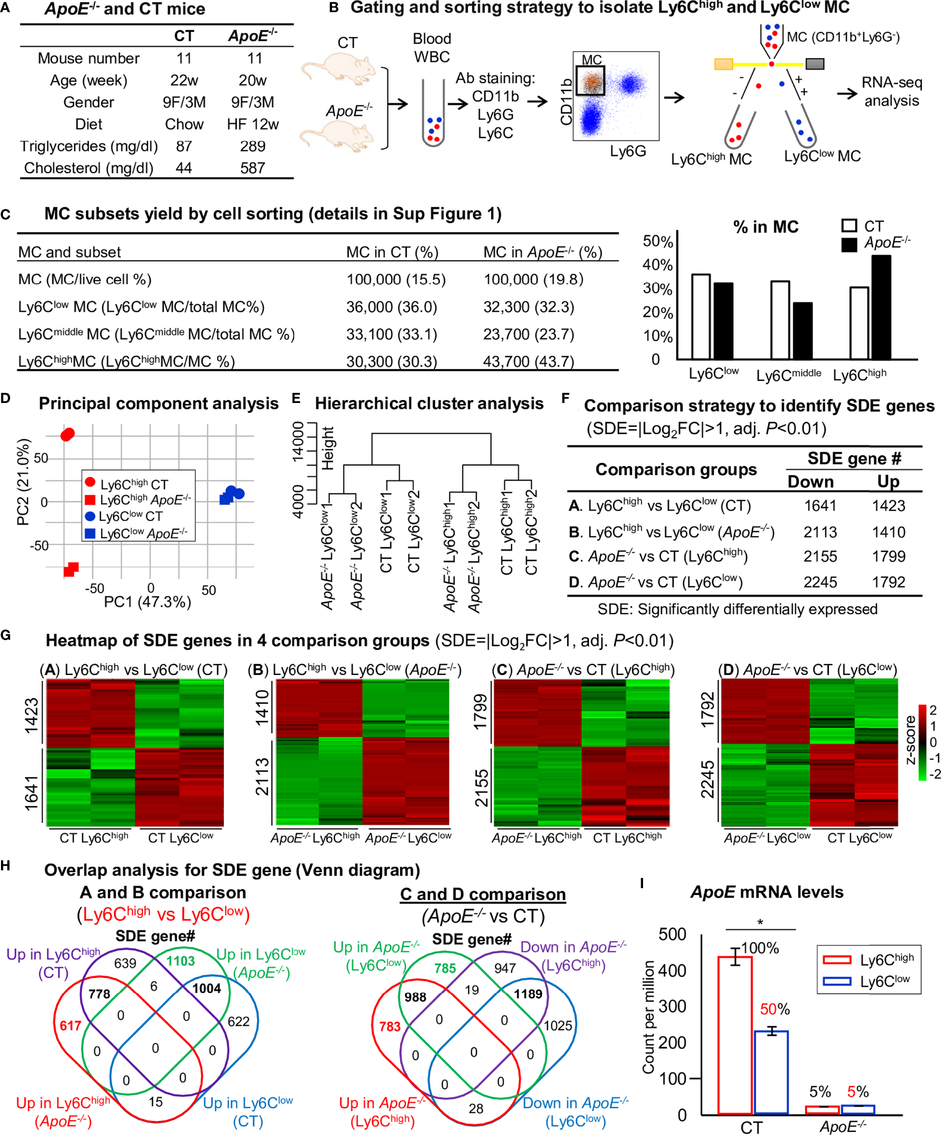 By overlap analysis, we identified 778 upregulated and 1004 downregulated SDE gene in Ly6Chigh MC in CT and ApoE-/- mice (Figure 2H). HL in ApoE-/- mice induced 988 upregulated and 1189 downregulated SDE gene in both Ly6Chigh and Ly6Clow MC. Interestingly, ApoE mRNA levels were significantly reduced to 50% in Ly6Clow MC compared with that in Ly6Chigh MC in CT mice, and depleted to about 5% in ApoE-/- mice (Figure 2I).