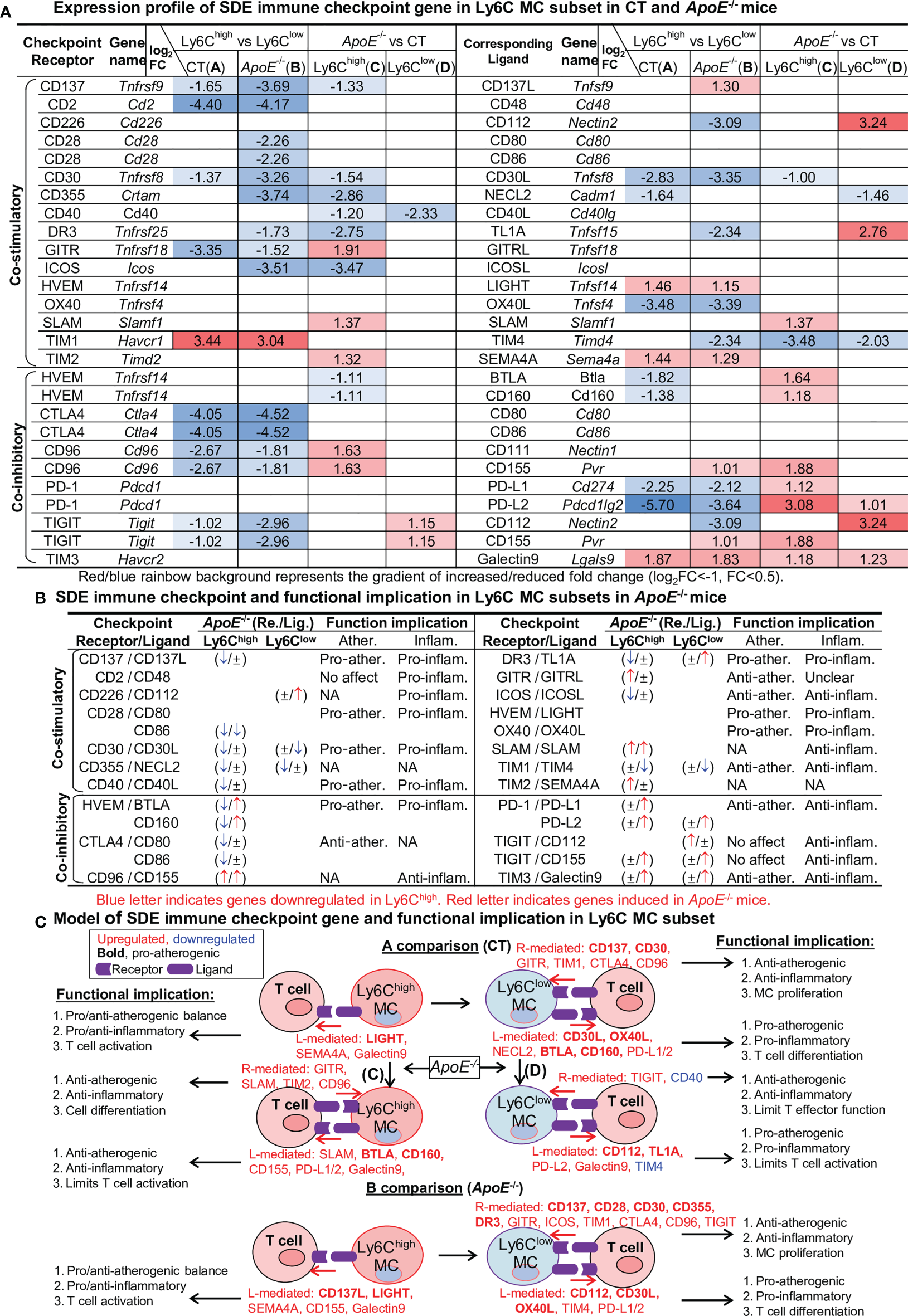 Identification of SDE immune checkpoint gene and function implication in Ly6C MC subset in CT and ApoE-/- mice. (A) Expression profile of SDE immune checkpoint gene. Sixteen pairs of SDE co-stimulatory and 11 pairs of SDE co-inhibitory molecules are identified in four comparison groups. (B) SDE immune checkpoint gene functional implication in Ly6C MC subsets in ApoE-/- mice. ↑ refers to induce expression by ApoE-/-. ↓ refers to reduce expression by ApoE-/-, ± refers to no changes in ApoE-/-. (C) Model of SDE immune checkpoint gene and functional implication. Red letter highlighted the representative up-regulated gene. Blue letter highlighted down-regulated genes. Bold letter emphasized pro-atherogenic function. NA, Not applicable.