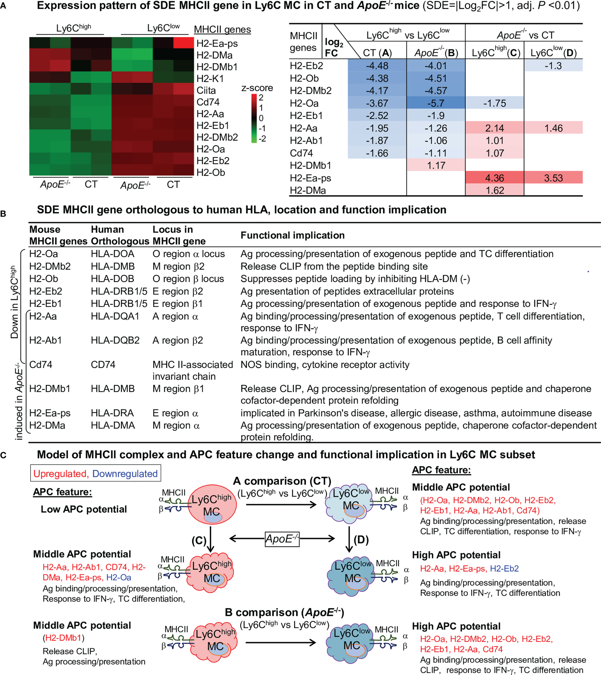Expression profile of 11 SDE MHCII gene are identified through four comparisons (Figure 7A). Ly6Clow MC is more like APC because of their higher levels of MHCII genes (H2-Oa, H2-DMb2, H2-Ob, H2-Eb2, H2-Eb1, H2-Aa, Cd74) compared to Ly6Chigh MC in both mice. ApoE-/- elevated the expression levels of MHCII genes in Ly6Chigh MC (H2-Aa, H2-Ab1, CD74, H2-Dma and H2-Ea-ps) and in Ly6Clow MC (H2-Aa and H2-Ea-ps). APC functional feature of SDE MHCII gene is described in Figure 7B. We modeled APC features in relevant with MHCII gene change in Ly6C MC subsets in Figure 7C.