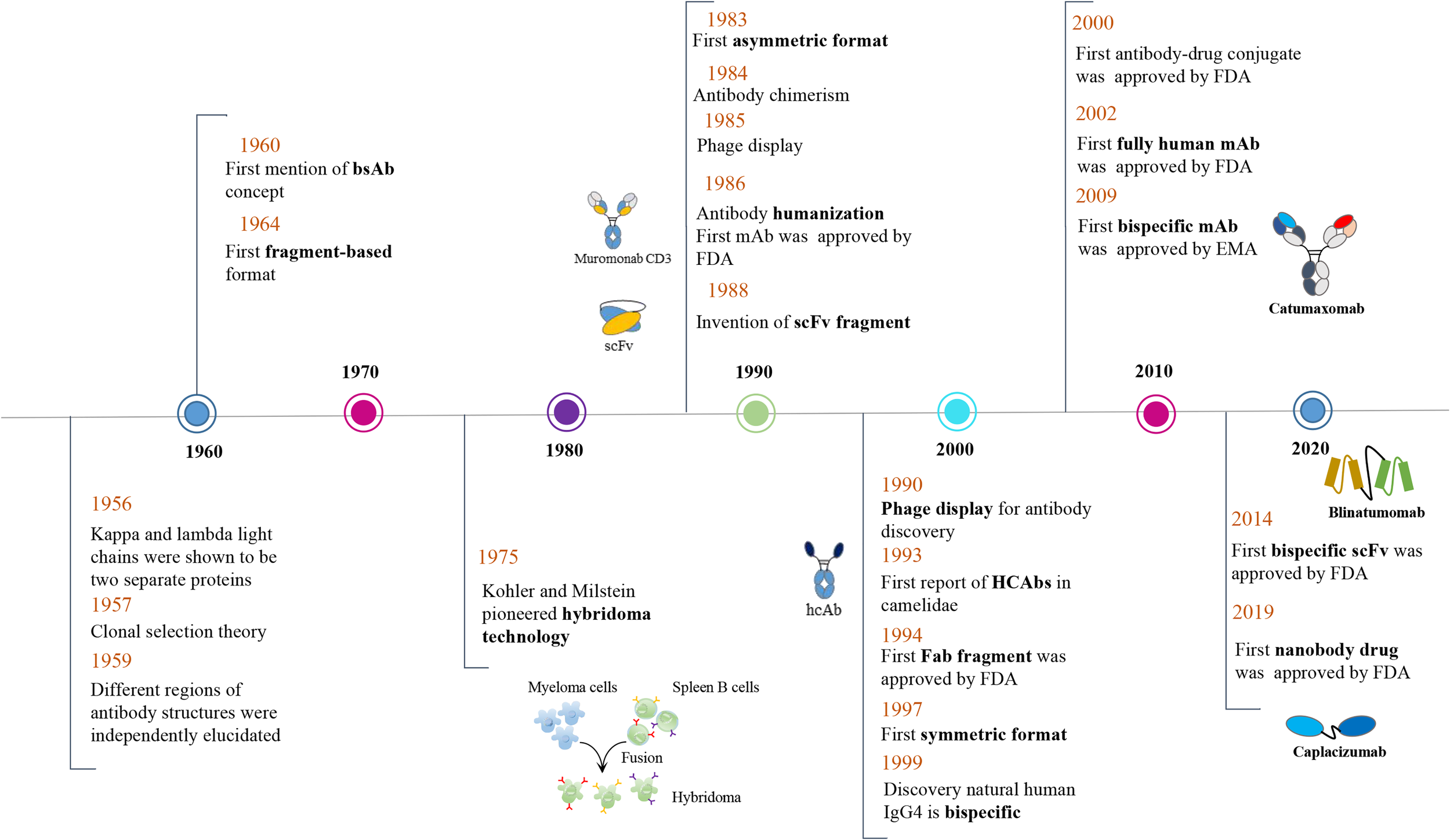 Timeline of conceptual and technical innovations contributing to the development of the multi-function nanobody landscape. The Camelidae “heavy-chain-only antibodies” were first reported by Hamers-Casterman et al. (7) in 1993 and the first bispecific antibody (Catumaxomab) was approved by EMA only in 2009 (56). In 2014, the first bispecific scFv (Blinatumomab) was approved by FDA (57) and the same agency approved, the first bivalent nanobody drug (Caplacizumab) for treatment of acquired thrombotic thrombocytopenic purpura (TTP) in 2019 (58).
