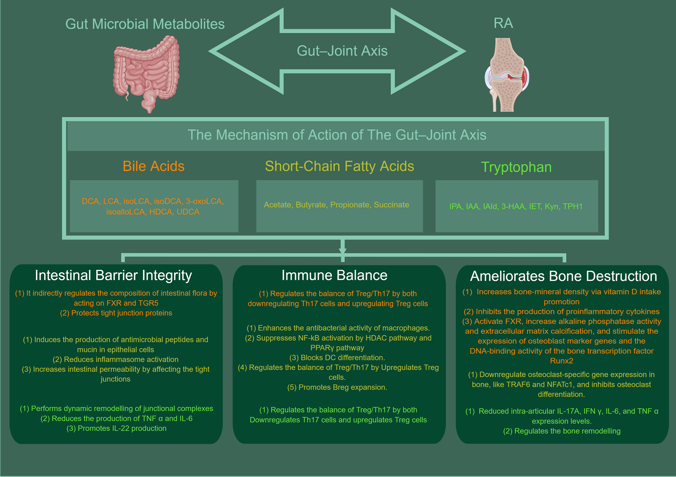 In conclusion, SCFAs involved in the RA gut–joint axis may play a role in protecting against RA by protecting the integrity of the intestinal environment, enhancing barrier function, and regulating immune cells to improve inflammatory responses and bone metabolism.