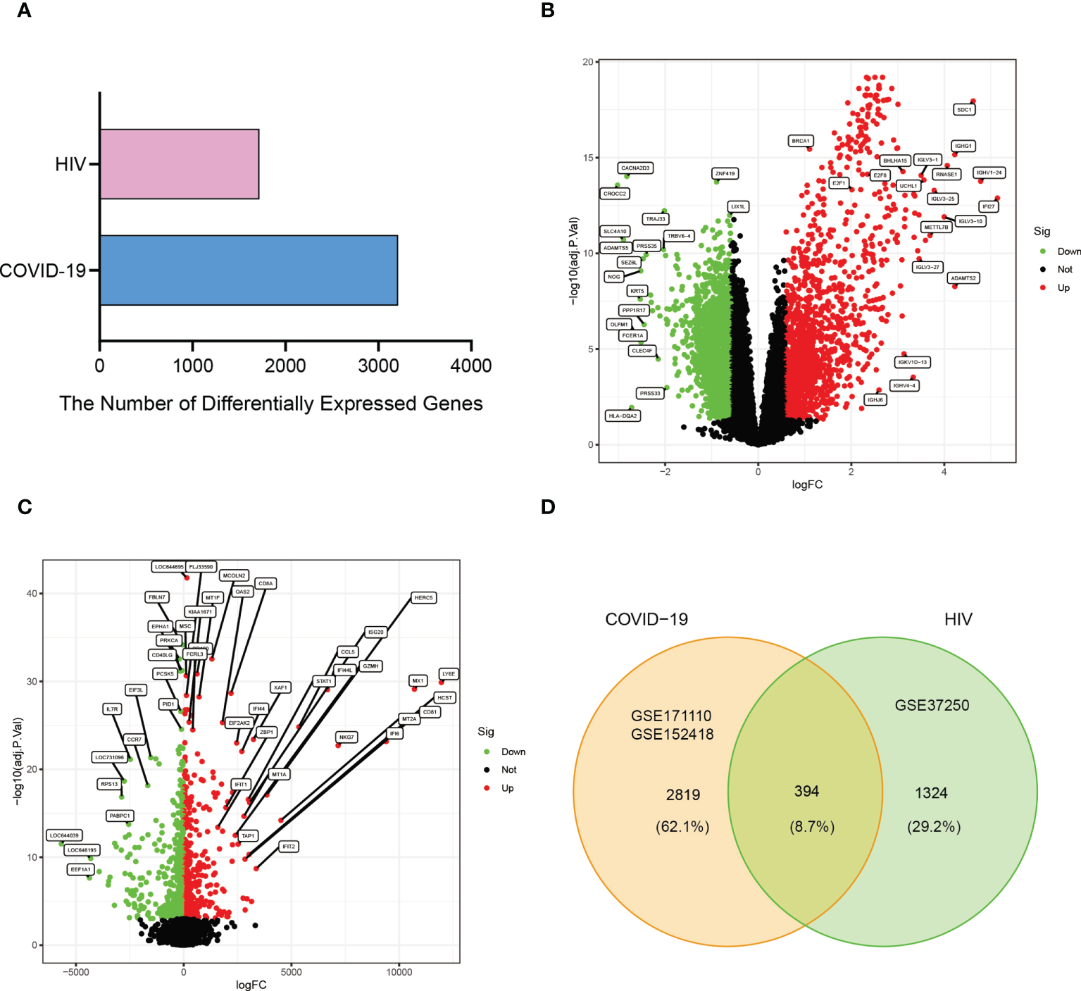 Visualization the number of common differentially expressed genes between two datasets, COVID-19 (GSE171110 and GSE152418) and HIV (GSE37250). (A) Comparing the number of differentially expressed genes between COVID-19 and HIV. (B) The volcano plot of differentially expressed genes in COVID-19 datasets. (C) The volcano plot of differentially expressed genes in the HIV dataset. (D) Venn diagram showing the overlap of differentially expressed genes between COVID-19 and HIV.