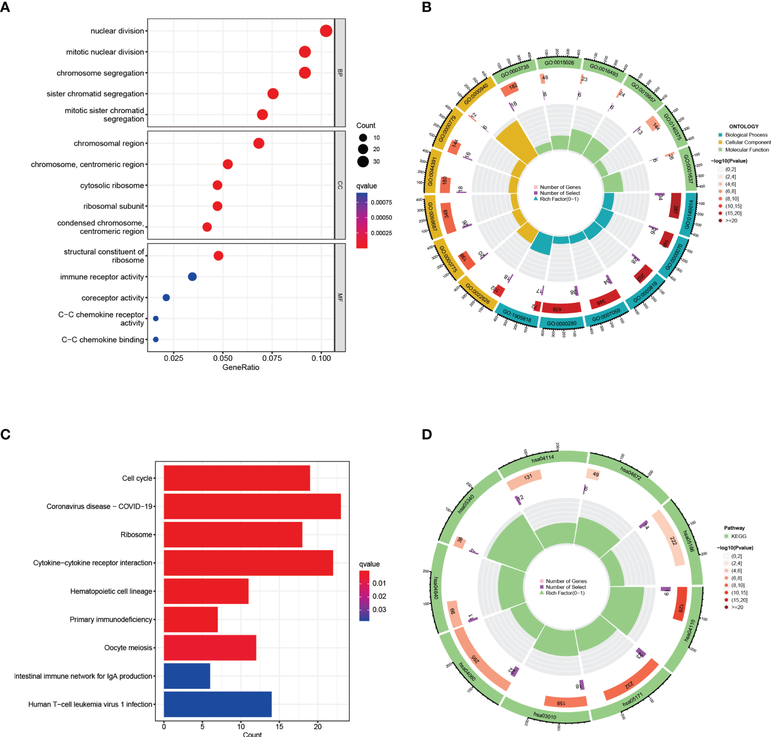 GO and KEGG functional enrichment analysis of the common differentially expressed genes between COVID-19 and HIV. (A) The bubble graphs of GO enrichment analysis. (B) Circle diagram of GO enrichment analysis. (C) The bar graphs of KEGG enrichment analysis. (D) Circle diagram of KEGG enrichment analysis.
