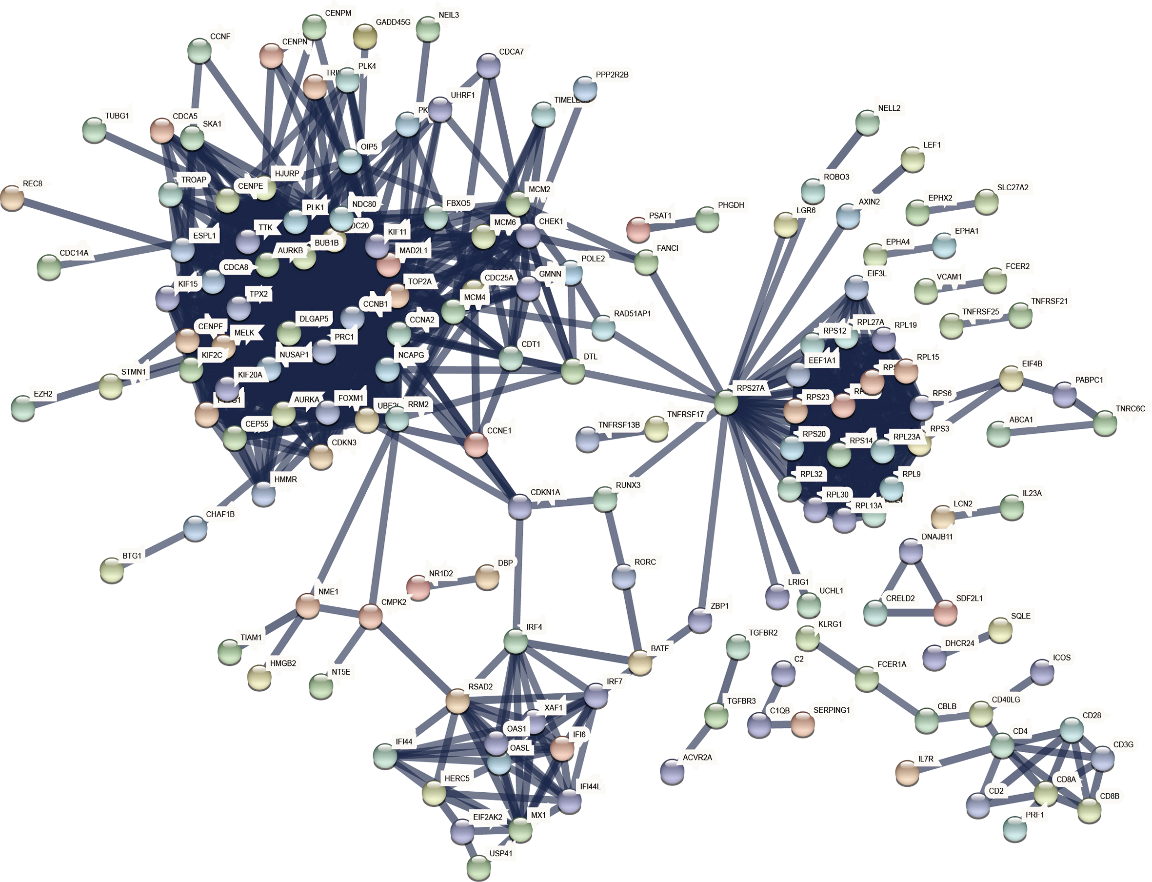 A comprehensive analysis of these common DEGs between COVID-19 and HIV was conducted using STRING to explore protein-protein interactions. Figure 4 illustrates the interactions between the common DEGs in HIV and COVID-19. As shown in Figure 5, top 10 hub genes were ranked according to their scores, which were identified using degree method based on the results of PPI network in Cytoscape, including CCNA2, CCNB1, CDC20, TOP2A, AURKB, PLK1, BUB1B, KIF11, DLGAP5, RRM2. Next, ROC analysis was conducted for HIV and COVID-19, respectively. Area under curve (AUC) values for all hub genes in the HIV dataset were greater than 0.616, whereas AUC values for all hub genes in the COVID-19 dataset were greater than 0.973 (Supplementary Figures 2, 3). According to these results, it is potential to develop novel targeted therapies against COVID-19 by targeting these hub genes.
