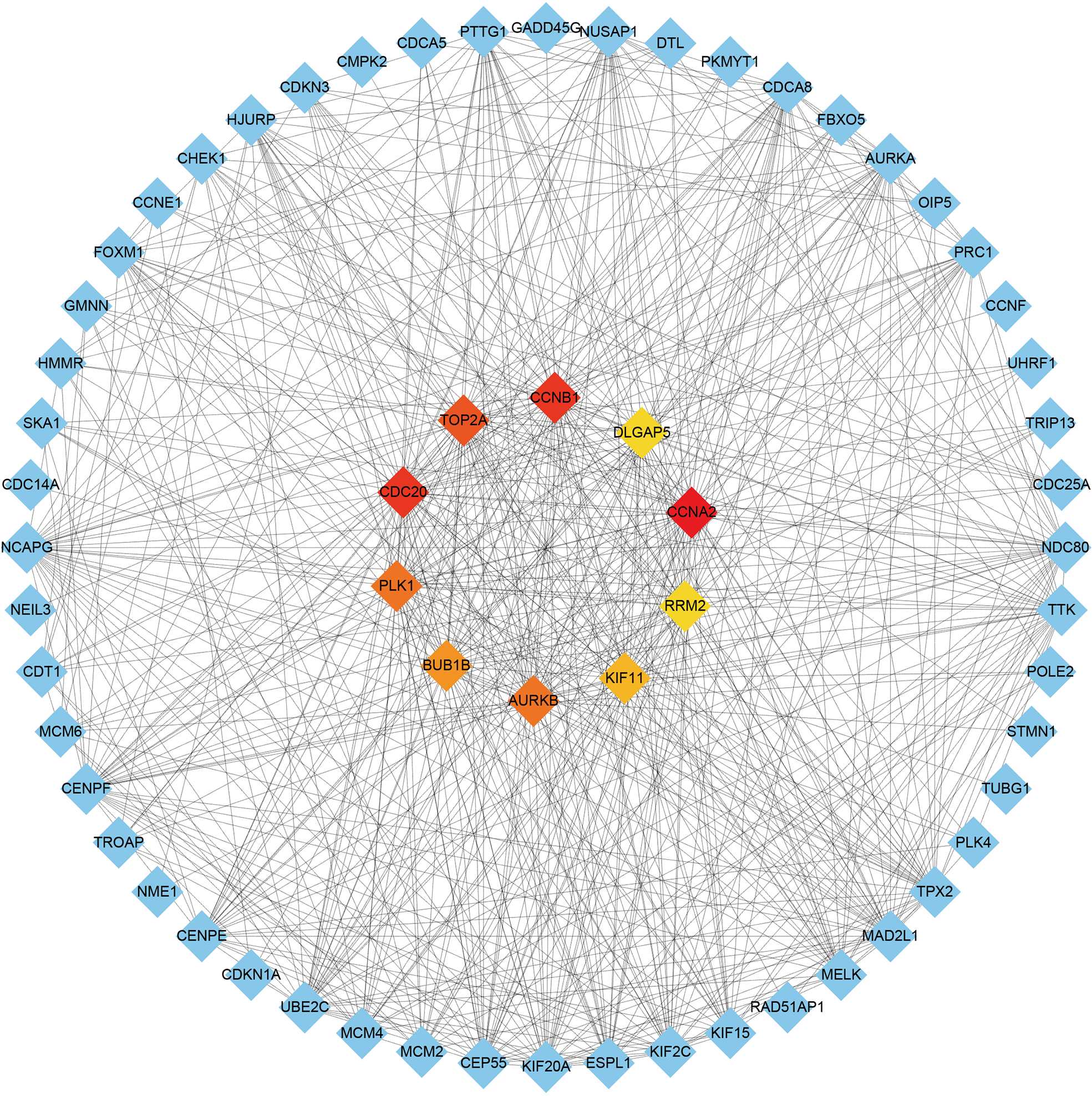Identification of the top 10 hub genes ranked by their scores. In the middle circle, the 10 central genes represent the top 10 hub genes ranked by their scores and their interactions with other common DEGs.