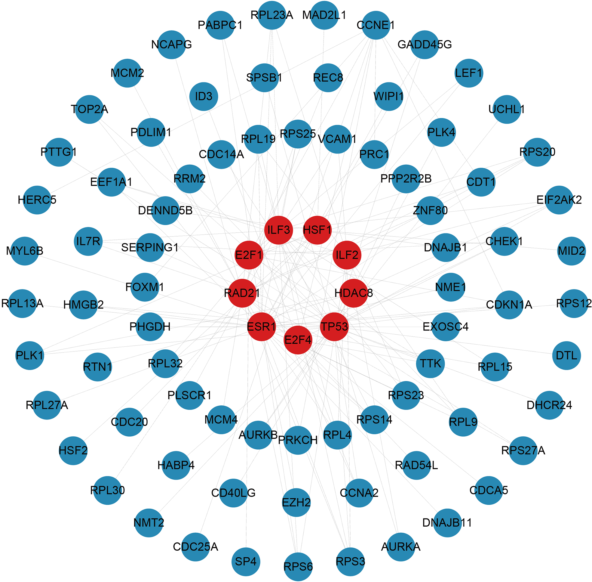 The top 10 transcription factors ranked according to their P values and their interactions with common differentially expressed genes. In this network, the red circles represent transcription factors with the top 10 lowest P values in the network, while the blue circles represent common differentially expressed genes correlated with transcription factors.