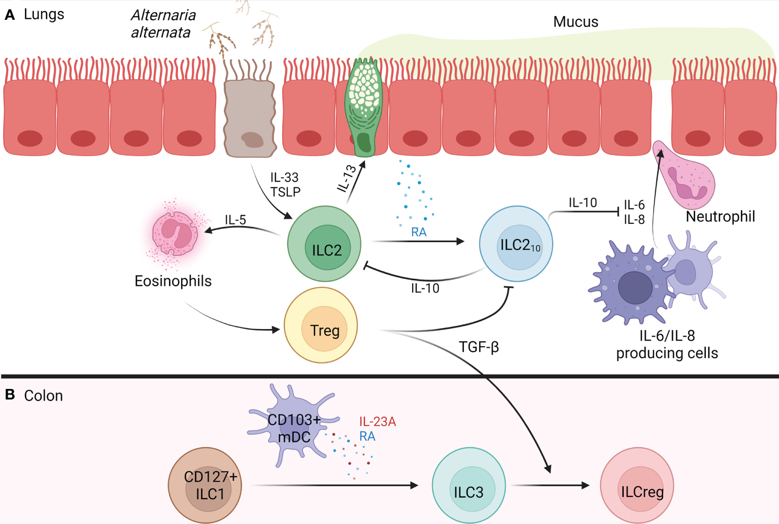 Development of IL-10+ ILCs in the Lung and Colon of Humans. (A)Alternaria alternata activates airway epithelium 2a) activated airway epithelium releases TSLP and IL-33 2a) IL-33 activates ILC2s, causing release of IL-5 and IL-13, while TSLP confers corticosteroid resistance 3a) IL-5 recruits and activates eosinophils 4a) IL-13 causes goblet cell hyperplasia, AHR, and release of RA from airway epithelium 5a) RA promotes the trans differentiation of ILC2s into ILC210s 6a) ILC210s release IL-10 which inhibits ILC2-mediated type 2 inflammation and maintains barrier integrity through the inhibition of IL-6 and IL-8 which function to increase barrier permeability, resulting in neutrophil transmigration 7a) Tregs form and regulate type 2 inflammation through release of TGF-β which blocks ILC210s. (B) In the colon, CD103+ mDCs release RA and IL-23A, promoting CD127+ ILC1s trans differentiation into ILC3s 2b) Tregs release TGF-β promoting the trans differentiation of ILC3s into ILCregs. AHR, airway hyperreactivity; ILC, innate lymphoid cell; ILC1, type 1 innate lymphoid cell; ILC2, type 2 innate lymphoid cell; ILC3, type 3 innate lymphoid cell; ILC210s, IL-10+ type 2 innate lymphoid cell; ILCreg, regulatory innate lymphoid cell; IL, interleukin; mDC, monocyte-derived dendritic cell; RA, retinoic acid; TGF-β, transforming growth factor beta; Treg, regulatory T cell; TSLP, thymic stromal lymphopoietin. Figure 1 was created using BioRender.com.