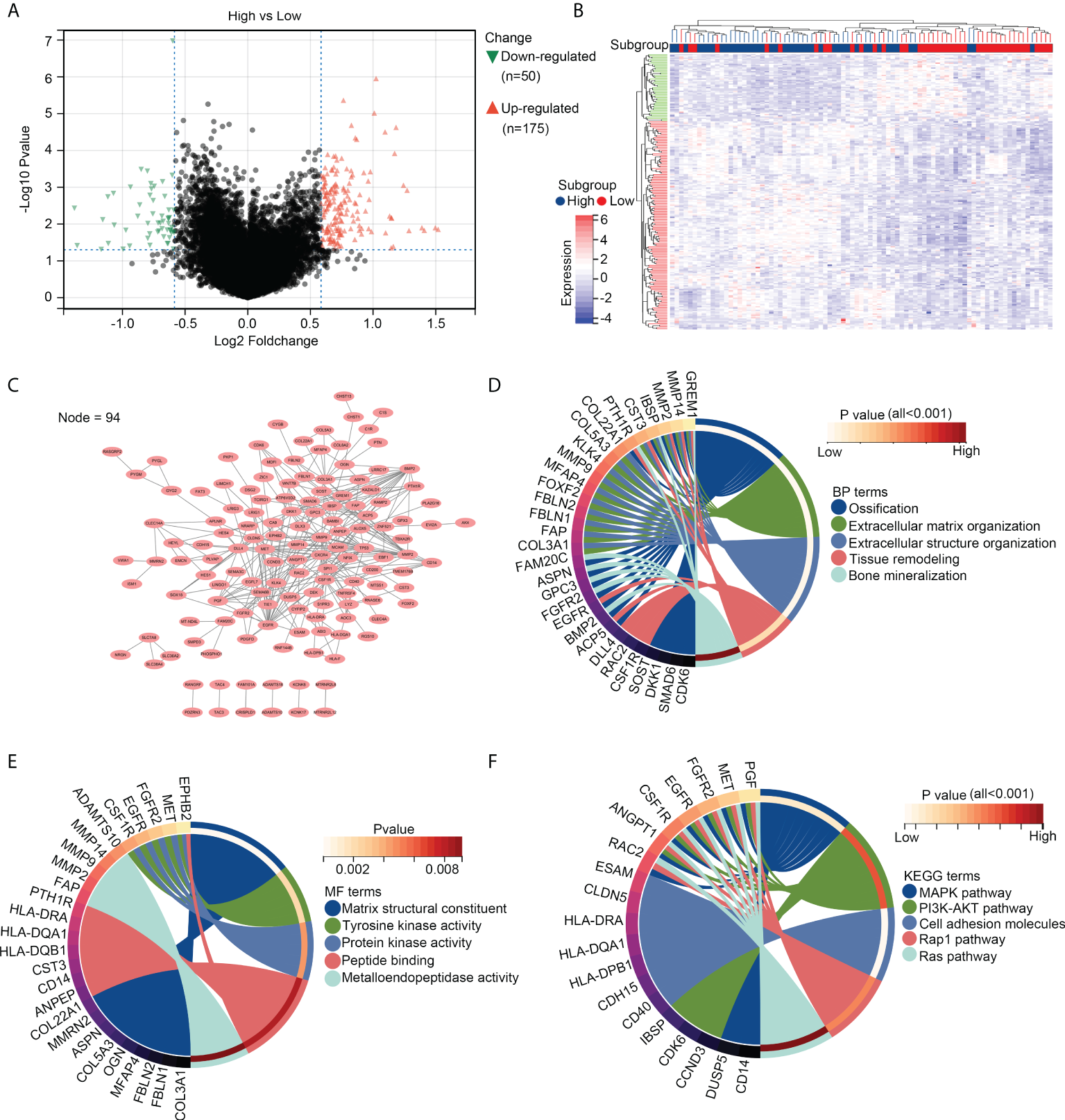 We then divided the OS tissues into high- and low-infiltration groups, according to the median levels of resting dendritic cells within these tissues. DEG analysis was performed, and a total of 175 upregulated genes and 50 downregulated genes were observed in OS tissues with a high infiltration of resting dendritic cells versus those with a low infiltration of resting dendritic cells (Figures 2A, B). We then performed a PPI network analysis and found that 94 of these genes were related to others (Figure 2C). Therefore, these 94 genes were set as resting dendritic cell-associated genes, and we focused on them. GO analysis revealed that these 94 genes were enriched in “ossification” (BP term; Figure 2D), “extracellular matrix organization” (BP term; Figure 2D), “extracellular structure organization” (BP term; Figure 2D), “tissue remodeling” (BP term; Figure 2D), “bone mineralization” (BP term; Figure 2D), “matrix structural constituent” (MF term; Figure 2E), “tyrosine kinase activity” (MF term; Figure 2E), “protein kinase activity” (MF term; Figure 2E), “peptide binding” (MF term; Figure 2E), and “metalloendopeptidase activity” (MF term; Figure 2E). KEGG analysis indicated that these genes were enriched in the MAPK, PI3K-AKT, cell adhesion, Rap1, and Ras pathways (Figure 2F).