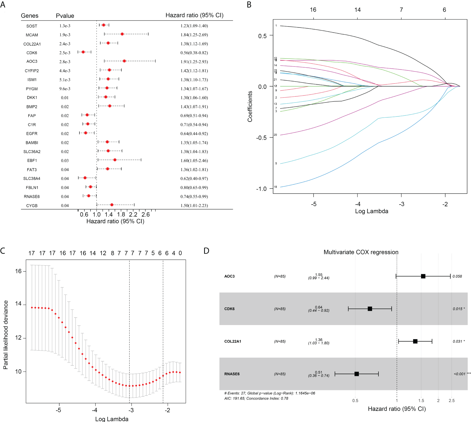 Figure 3 Construction of a risk model. (A) Univariate COX regression analysis for the 94 genes associated with the infiltration of resting dendritic cells. (B, C) LASSO analysis for other important genes associated with the survival rate of OS. (D) The HR and p value of genes (including AOC3, CDK6, COL22A1 and RNASE6) under multivariate COX analysis are shown.