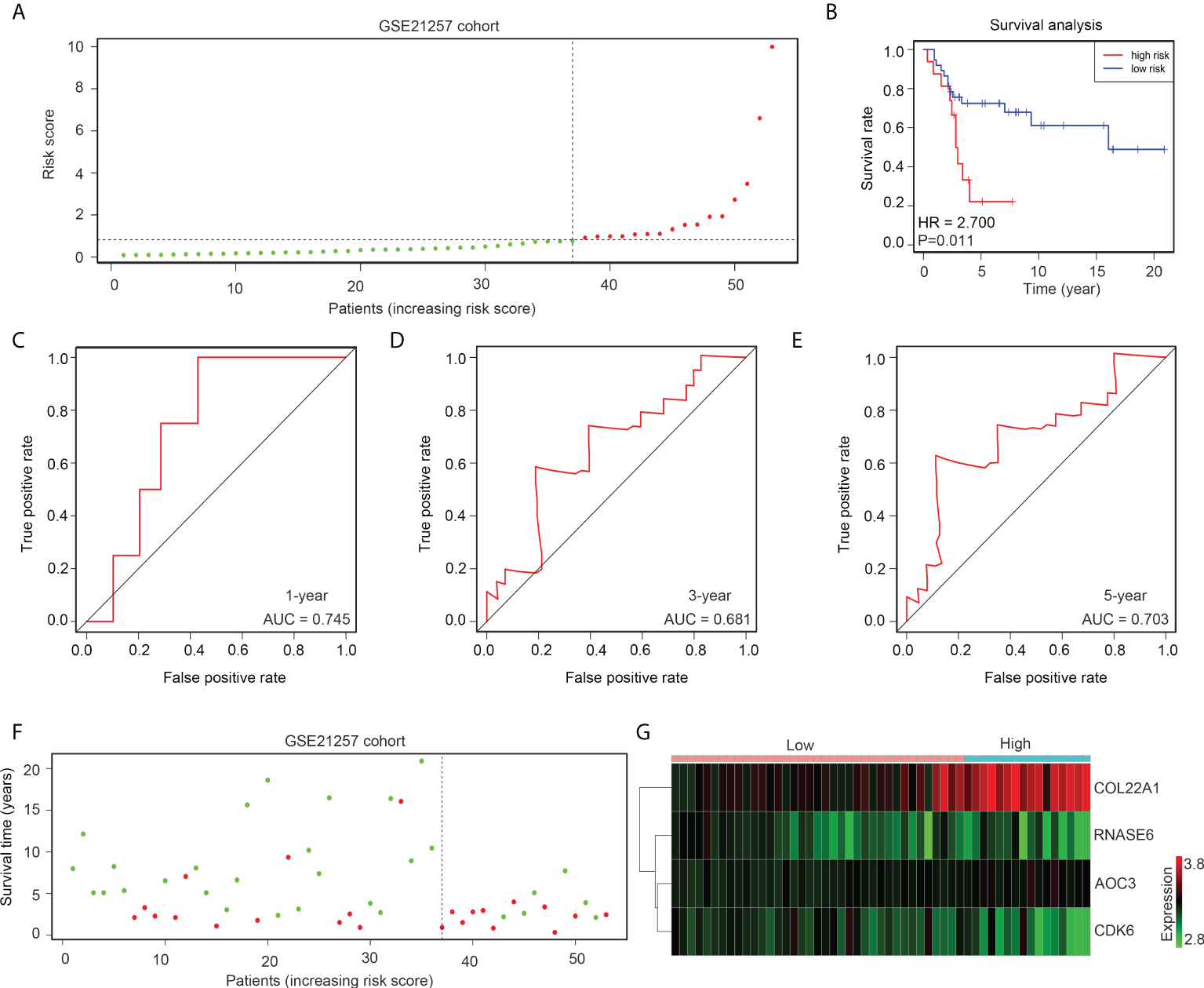 Figure 5 The risk model exhibits high prognostic value in the GSE21257 verification cohort. (A) OS tissues in GSE21257 were divided into low- and high-risk groups according to median risk scores. (B) Kaplan survival analysis indicated the difference between low- and high-risk group OS tissues in GSE21257. (C–E) ROC analysis of the risk model for the 1-year, 3-year, and 5-year survival rates for OS patients in GSE21257. (F) Alive and death cases between low- and high-risk group OS tissues in GSE21257. (G) Expression of COL22A1, CDK6, RNASE6 and AOC3 between low- and high-risk group OS tissues in GSE21257.