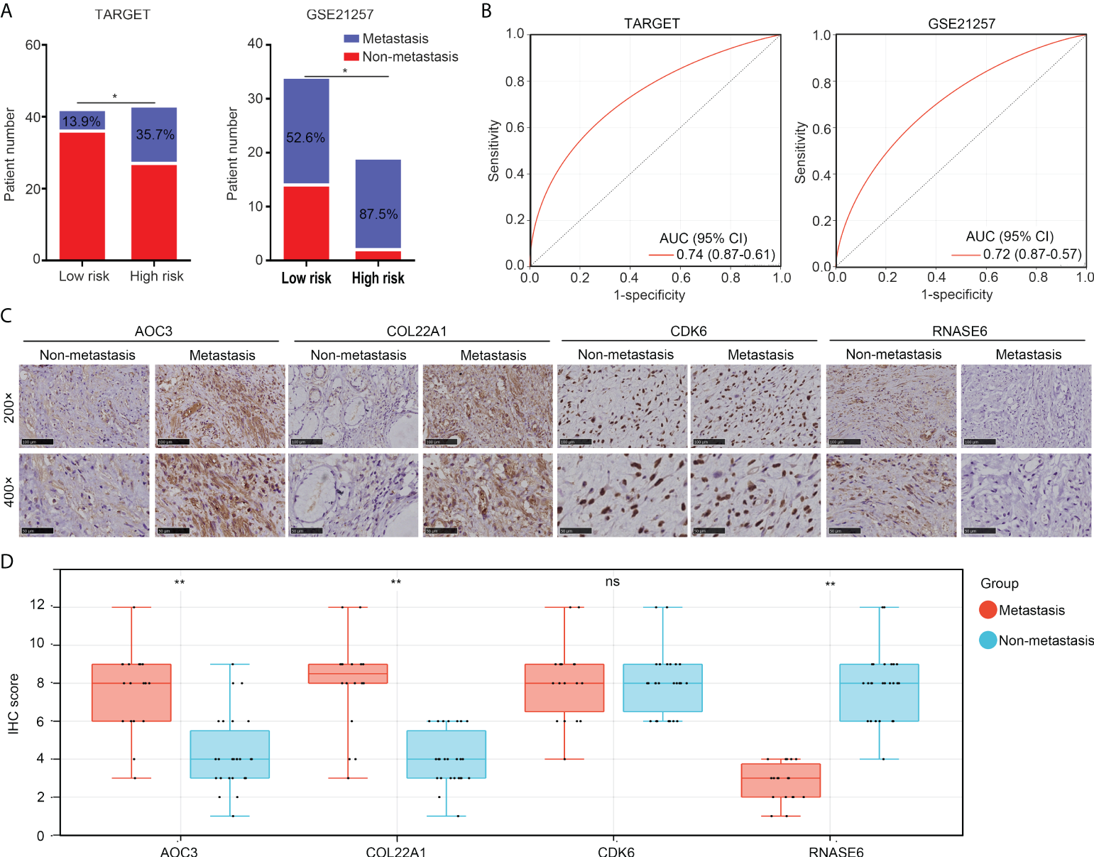 Figure 6 The risk model has the potential to predict metastasis in patients with OS. (A) Non-metastasis and metastasis cases between low- and high-risk group OS tissues in the TARGET and GSE21257 cohorts. (B) ROC analysis for the diagnostic value of the risk model in the prediction of OS tissue metastasis. (C, D) IHC was performed to detect the expression of COL22A1, CDK6, RNASE6 and AOC3 in non-metastasis and metastasis OS tissues (magnification 200× and 400×). *p < 0.05; **p < 0.01; ns, no significant.