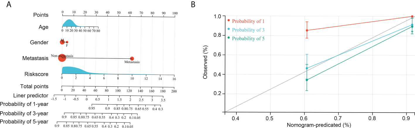 Figure 7 Construction of the nomogram. (A) Age, gender, risk score, and metastasis was used to construct the nomogram. (B) Efficiency of the nomogram in the 1-year, 3-year, and 5-year survival rates of patients with OS.