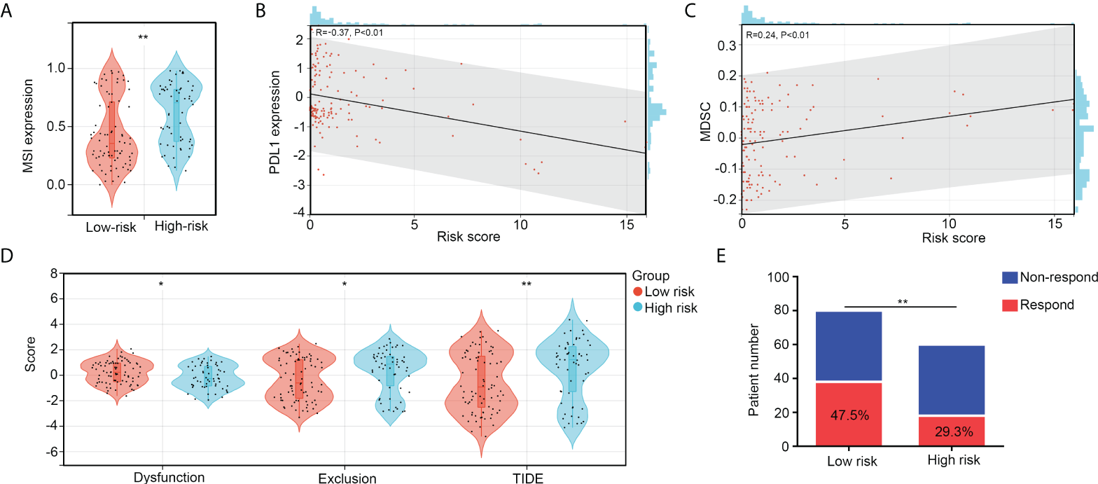 Figure 8 The high-risk group patients with OS exhibit resistance to ICB. (A) MSI scores between high- and low-risk group OS tissues. (B) Co-expression relationships between risk scores and PDL1 expression. (C) Co-expression relationships between risk scores and MDSC levels. (D) The difference of exclusion, dysregulation, and TIDE scores between high- and low-risk group OS tissues. (E) Predication of non-responder and responder numbers after ICB in high- and low-risk group OS tissues. *p < 0.05, **p < 0.01.
