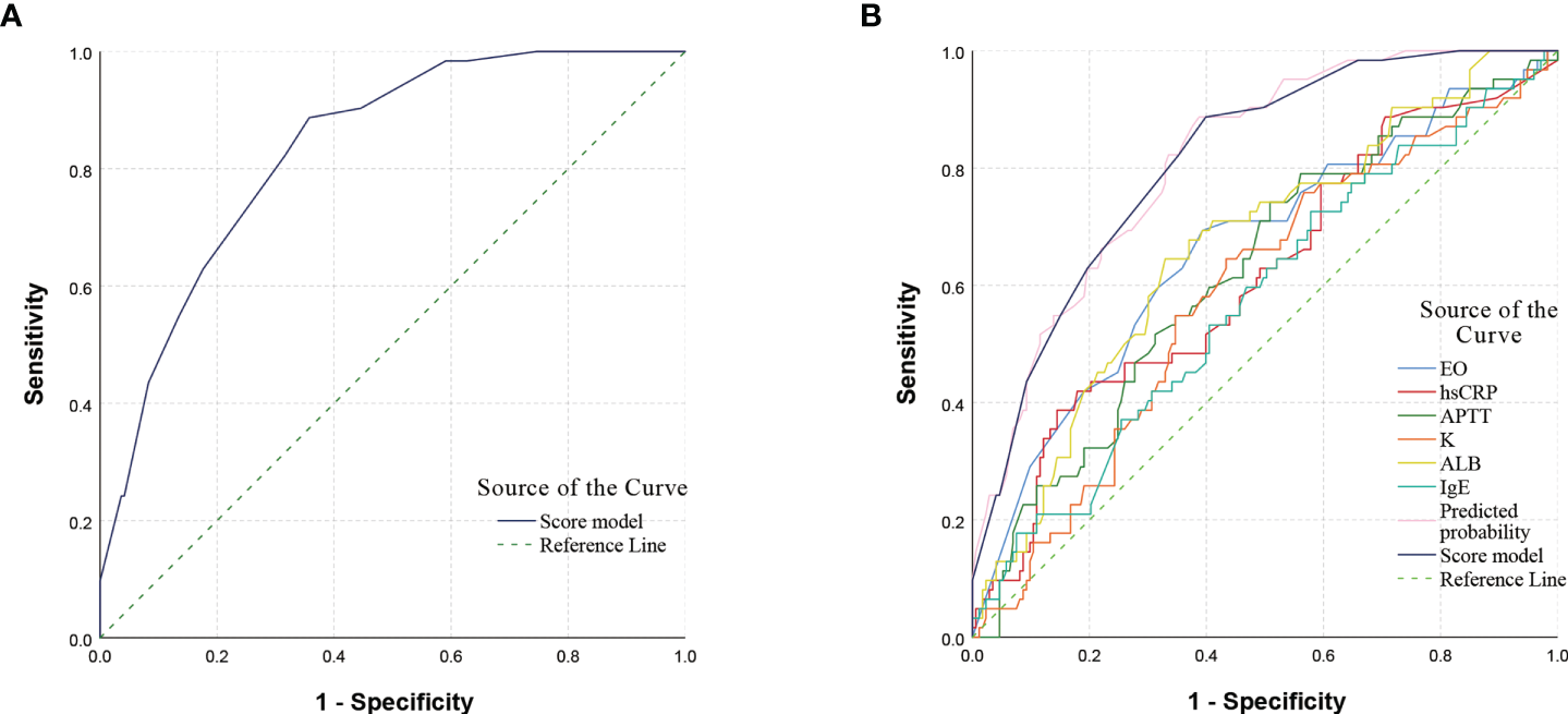 There have been many reports on the relationship between organ involvement and laboratory indicators in HSP patients (26, 27), but they have all investigated whether some scattered laboratory indicators were risk factors for organ involvement in HSP patients, and to our knowledge no study has constructed and validated a predictive model that combined multiple indicators. One of the limitations of individual risk factors to predict outcome is that they are susceptible to confounding factors, and different centers, populations, and regions may reach opposite conclusions. Regarding laboratory risk factors and organ involvement in HSP, NLR was by far one of the most numerous and important risk factors (21, 22, 26, 27). Most findings suggested that high NLR was associated with GI and renal involvement in HSP (22, 26, 27), however, some authors have come to the opposite conclusion (21). In our results, the NLR was also higher in the GI bleeding group than in the GI non-bleeding group (4.2 vs. 2.4), and the difference was statistically significant (P < 0.001). After regression analysis, NLR did not enter the final prediction model. It was suggested that prediction by NLR alone may have limitations for different regions or populations. Therefore, we constructed a prediction model including several indicators, namely EO, hsCRP, APTT, K, ALB and IgE for a total of six indicators.