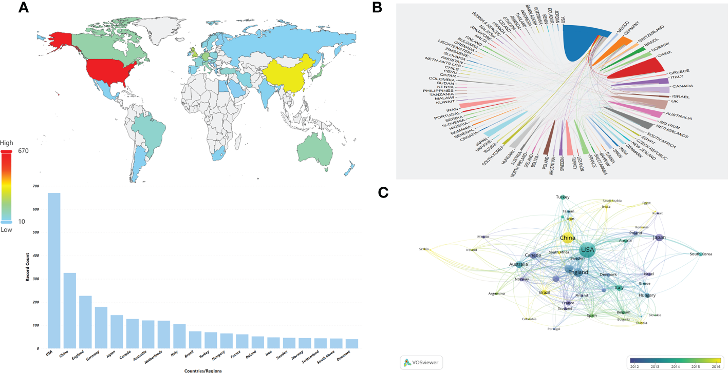 Figure 3 Distribution of countries or regions and mutual cooperation relations. (A) Distribution of the top 10 countries/regions in terms of number of publications on the world map. (B) The cooperative network map between countries or regions. The color represents different countries/regions,the area represents the number of citations in each country or region, and the thickness of the connecting line indicates the cooperation frequency. (C) Overlay visualization of country/region cooperation analysis. The circles indicate different countries/regions, the color represents the average year, the area of the circle represents the number of citations in each country or region, the distance indicates the correlation between each country/region, and the thickness of the connecting line indicates the strength of co-authorship cooperation.
