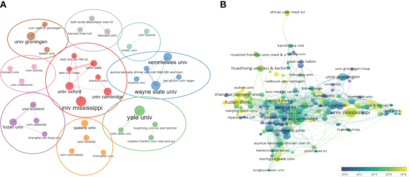 We then evaluated the number of publications from 2,174 universities or institutions worldwide. UNIVERSITY OF MISSISSIPPI, with a total of 66 publications, had the highest number of publications in the last 20 years, followed by YALE UNIVERSITY (n = 61), UNIVERSITY OF LONDON (n = 52). We analyzed the collaborative relationships between universities or institutions. Among the top 50 universities or institutions, 48 have established inter-collaborative relationships, and further visualization was shown in Figure 4A. It could form nine clusters, respectively, with UNIVERSITY OF MISSISSIPPI (univ mississippi), YALE UNIVERSITY (yale univ),Queen’s University (queens univ),Fudan University (fudan univ),UNIVERSITY OF SYDNEY(univ sydney),University of Groningen (univ groningen),HARVARD UNIVERSITY(harvard univ),Brown University (brown univ),WAYNE STATE UNIVERSITY(wayne state univ) as the main sponsoring research universities or institutions. UNIVERSITY OF MISSISSIPPI (n = 66) was the largest sponsoring institution, with close cooperation between several institutions. Subsequently, we applied VOSviewer software to construct a collaborative network, setting the threshold to a minimum number of publications of 5 and a minimum number of citations of 100, and identified a total of 208 universities or institutions. As shown in Figure 4B, the collaboration among universities or institutions gradually increased after 2010 over time. UNIVERSITY OF MISSISSIPPI was the most active institution in international collaboration in the past 5 years, and those in China such as Fudan University, Nanjing Medical University and Wuhan University had produced more studies and were active in international collaboration in the past 3 years.