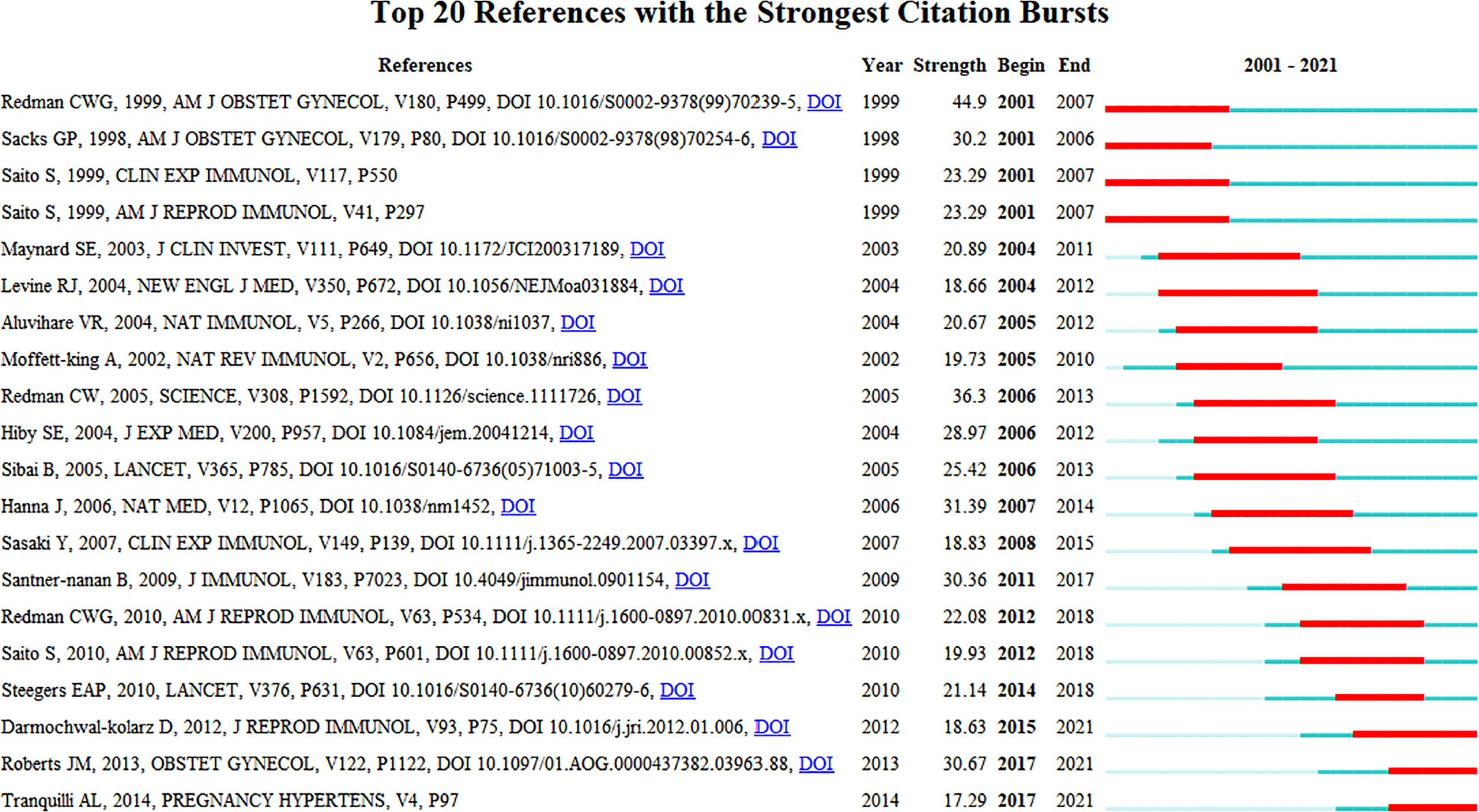 The co-citation analysis provides insight into past HDP and immune cell research hotspots in the past and predicts future research directions. Setting the duration of the burst at greater than or equal to 4 years, the top 20 most cited articles are listed in Figure 7. The peak of article citations tends to be 1 - 2 years after the publication of the article and lasts for 4-5 years. Multiple highly cited articles appeared from 2001 to 2015.In the last 3 years, the heat of highly cited articles continues to the present, and the current research hotspots are immune imbalances, such as increased pro-inflammatory CD4+ T cells, decreased Treg, the Th1/Th2 immune balance, up-regulation Th17 cells, and regulatory cytokine IL-10, affecting the progression of preeclampsia. We anticipate that future research will continue to focus on the impact of different components of the immune system at the maternal-fetal interface on the progression of HDP, and on the development of effective drugs to prevent or improve maternal and fetal outcomes based on the physiological mechanisms of pathogenesis.