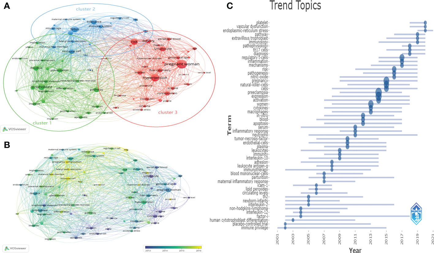 From the 2,388 published records, we could extract 41,716 keywords. The keywords with more than 100 occurrences were divided into three clusters by co-occurrence analysis, which facilitated a systematic understanding between keywords in the field (Figure 8A). The three most frequently used keywords in the three clusters were “pregnant woman”, “trophoblast” and “fetus”. Cluster 1, the study focuses on immune cell changes in the maternal decidua during trophoblast invasion. migration, apoptosis, vitro, endothelial cell, proliferation, secretion, invasion, pathway differentiation, angiogenesis, trophoblast, trophoblast invasion, intrauterine growth restrictio, placentation, decidua, placental development, endometrium, uterus, and implantation are receiving increasing attention. Cluster 2, immune tolerance to semi-isogenic fetal antigens at the maternal-fetal interface is the main focus, including maternal immune system, miscarriage, fetus, fetal growth restriction, maternal fetal interface, immune cell, fetal, hlag, regulatory t cell, treg, cd4, tolerance, immune system. Cluster 3, “prenant woman” is the largest node, which focuses on clinical syndromes that occur in prenant women, with the main focus including oxidative stress, tnf alpha, interleukin, plasma concentration, enzyme, ifn gamma, mrna, serum, proteinuria, hypertension, marker, flow cytometry, pe patient, serum level, onset, pregnant women, hypertensive disorder, gestational disorder, and the clinical syndrome. hypertensive disorder, gestational age, age, lymphocyte, diagnosis, risk, delivery, peripheral blood, and prevention. This group of topics examines the changes and mechanisms of immune cells that cause maternal clinical syndrome. Figure 8B presents those keywords according to the average time of appearance. We could observe that immune cell changes at the maternal-fetal interface, such as treg, were still the hot topic in recent years. Figure 8C indicated the evolution of the keywords studied over time and duration. In the last 3 years, the impact of pathways related to regulatory t-cells, th17, and vascular dysfunction on the development of HDP and the prediction of disease progression have been studied. Future research is likely to remain focused on investigating the specific mechanisms of different immune cells in the maternal-fetal interface, and the translation of related research.