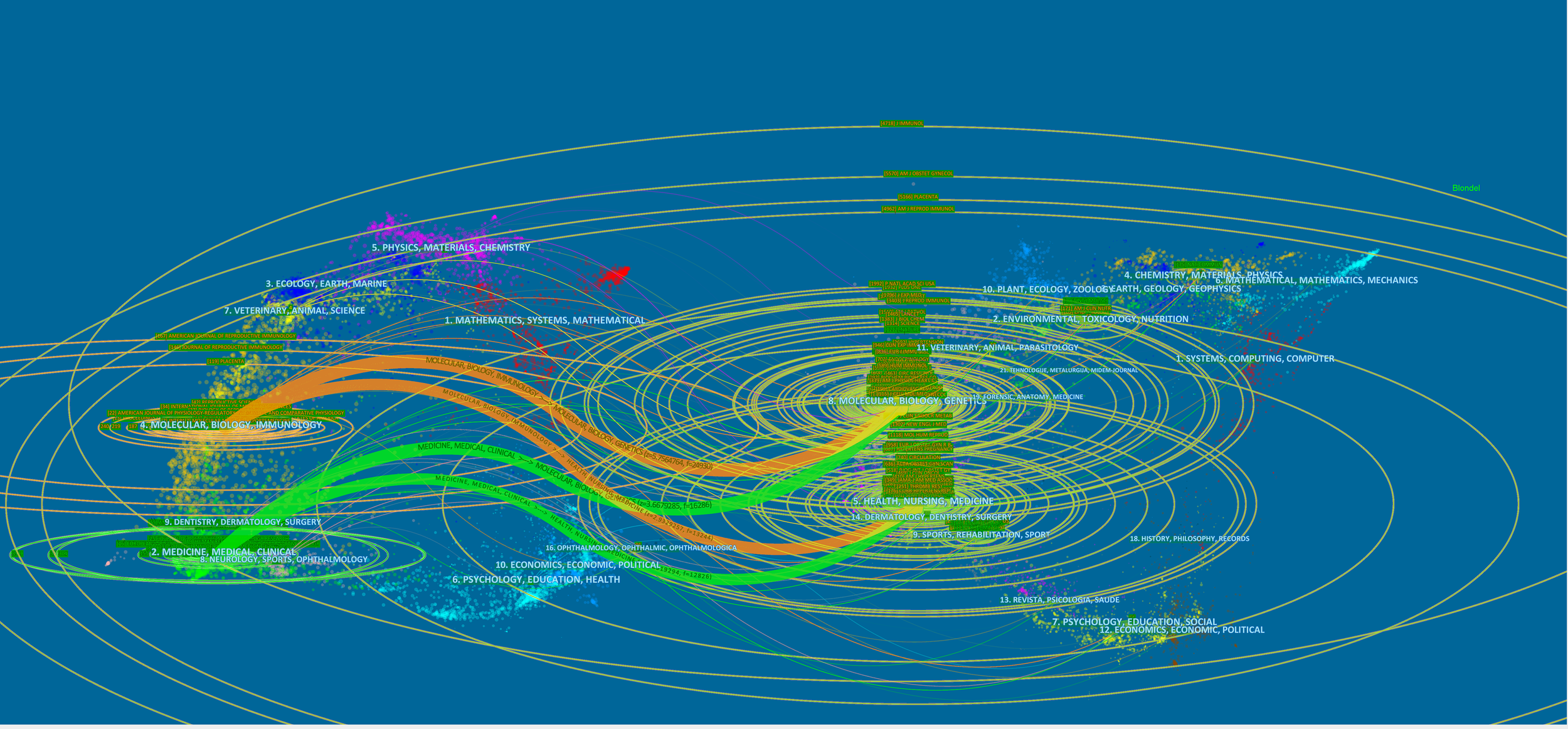The 2,388 publications we studied were divided into two main areas, one including molecular, biology, and immunology; the second area including medicine, medical, and clinical. In Figure 9, we could find that the references of these 2,388 articles were mainly distributed in the following fields: molecular, biology, immunology, genetic, medicine, medicine and clinical. In addition, nursing, sports also had some influence on this study. We found that the role of immune cells in HDP mainly involved molecular biological mechanisms related to genes, but we could not ignore the influence such as nursing and sports. The development of this field should not be limited to the in-depth exploration of molecular biology, but needs to consider multiple influences.
