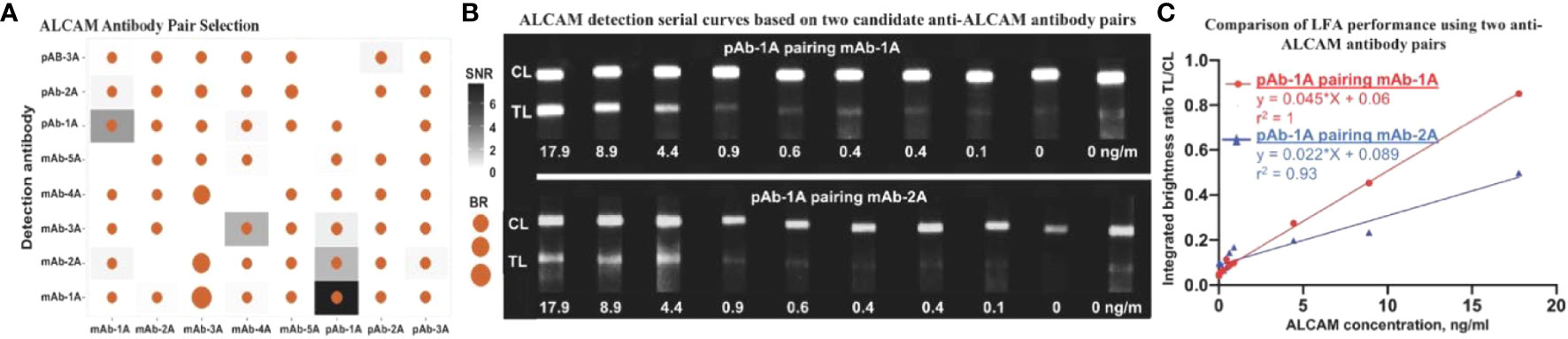 Figure 1 Antibody pair selection for construction of ALCAM LFA. (A) 57 antibody pairs (eight types of antibodies were tested in all combinations and with each serving as detection Ab-the antibody conjugated onto the nanophosphors and as capture Ab-the antibody immobilized onto the LFA strip) were tested for ALCAM LFA performance, of which two pairs showed relatively high SNR and brightness ratio. (B) Serial curve of nanophosphor-based LFA were constructed for ALCAM detection in buffer. Each concentration point was singularly tested except for negative controls (0 ng/ml) in duplicate. These grayscale images were collected using a FluorChem gel documentation and were analyzed using ImageJ. (C) Integrated brightness ratio (TL/CL) as a function of ALCAM concentration showed that pAb-1A as capture antibody and mAb-1A as detection antibody achieved the highest LFA performance with high linearity (r2) of 1. The positive (17.9 ng/ml) and negative (0 ng/ml) buffer under both candidate antibody pairs were tested twice before constructing the standard curves. SNR, signal-to-noise ratio (In a given antibody pair, the integrated brightness at the TL of that positive LFA strip over the integrated brightness at the TL of that negative strip with no analyte).; BR, Brightness ratio (the integrated brightness intensity of TL over that of CL); TL, test line; C,: control line; pAb-1A, polyclonal anti-ALCAM antibody from R&D; mAb-1A, monoclonal anti-ALCAM antibody from R&D; The other antibody types tested were purchased from Biolegend, Thermo Fisher Scientific, Santa Cruz, and ABclonal, as detailed in Supplementary Tables S2–4.