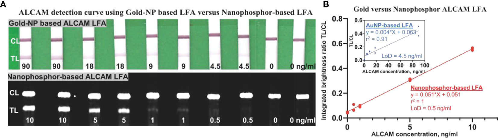 To compare the performance of nanophosphor-based LFA in ALCAM detection to traditional colorimetric colloidal gold nanoparticles (AuNPs), pAb-1A as capture antibody and mAb-1A as detection antibody were utilized for nanophosphor-based LFA, while mAb-2A as detection antibody was utilized for AuNP-based LFA. This selection was based on the high background of pAb-1A paired with mAb1-A in AuNP-based LFA (data not shown). Nanophosphors and AuNPs were functionalized separately, and 40 µl of running buffer-A1 was used to drive the flow of AuNPs and nanophosphors in the experiments shown in Figure 2A. For both LFAs, ALCAM detection standard curves were constructed. Figure 2B demonstrates the correlation between ALCAM concentration and integrated brightness ratio using the AuNP- and nanophosphor-based LFA. With nanophosphor-based LFA, the r2 and LoD of ALCAM detection were 1 and 0.5 ng/ml, respectively. With AuNPs-based LFA, the r2 and LoD of ALCAM detection were 0.91 and 4.5 ng/ml, respectively. Thus, ALCAM detection using a nanophosphor-based LFA outperformed traditional AuNPs-based LFA in linearity (r2) and limit of detection, and were used for the rest of the assays.