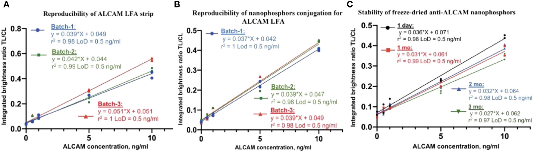 To assess the reproducibility of ALCAM LFA strip preparation, three different batches of anti-ALCAM strips (pAb-1A as capture antibody) were assembled and stored with desiccant at room temperature. To verify the reproducibility of the anti-ALCAM (mAb-1A as detection antibody) conjugation process, three different batches of anti-ALCAM conjugated nanophosphors were prepared and tested. The reproducibility of ALCAM LFA strip preparation was verified by showing no significant difference in the linearity r2 and LoD (0.5 ng/ml) among the three batches by one-way ANOVA (Figure 3A). Likewise, the reproducibility of anti-ALCAM conjugated nanophosphors preparation was also confirmed (Figure 3B).