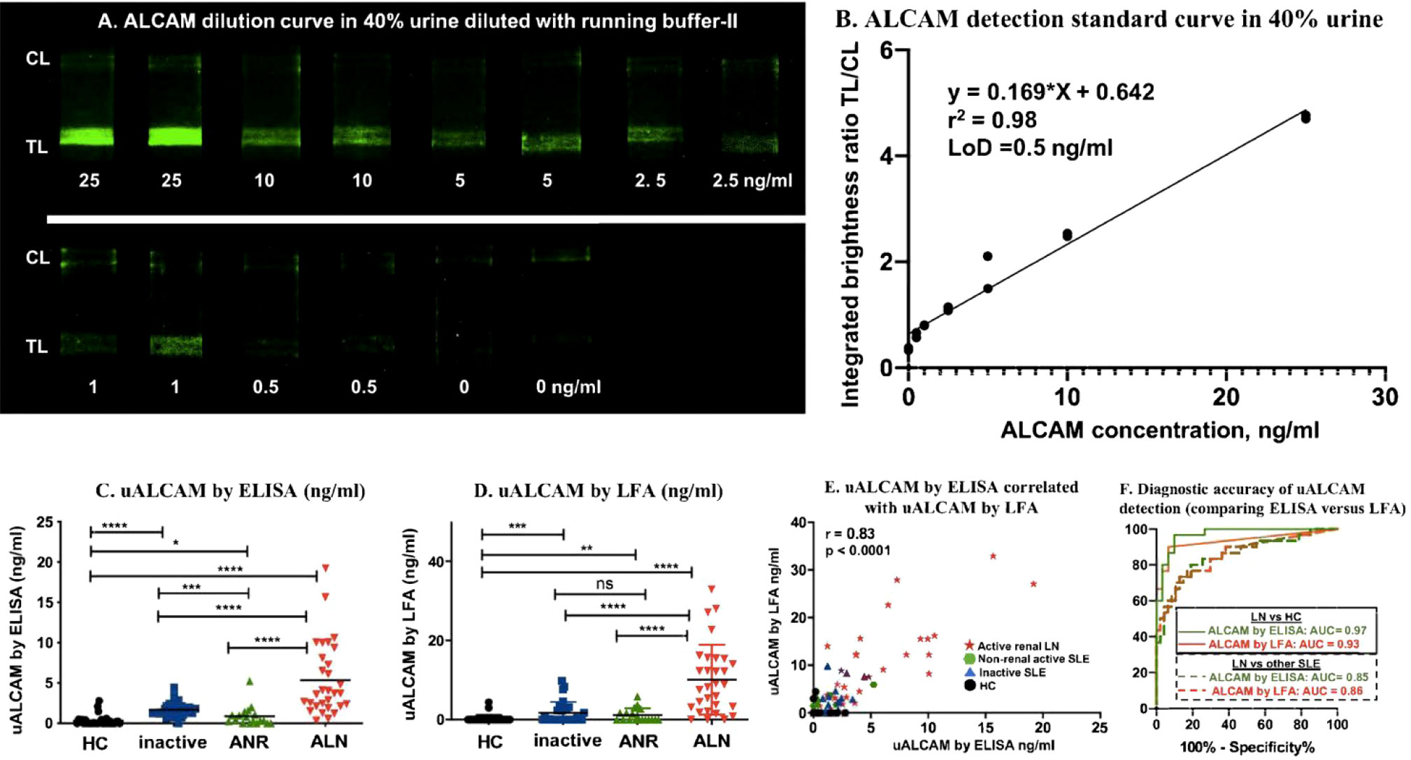 Results: The LFA tests for both un-normalized uALCAM (AUC=0.93) and urine normalizer (HVEM)-normalized uALCAM (AUC=0.91) exhibited excellent accuracies in distinguishing ALN from healthy controls. The accuracies for distinguishing ALN from all other lupus patients were 0.86 and 0.74, respectively.