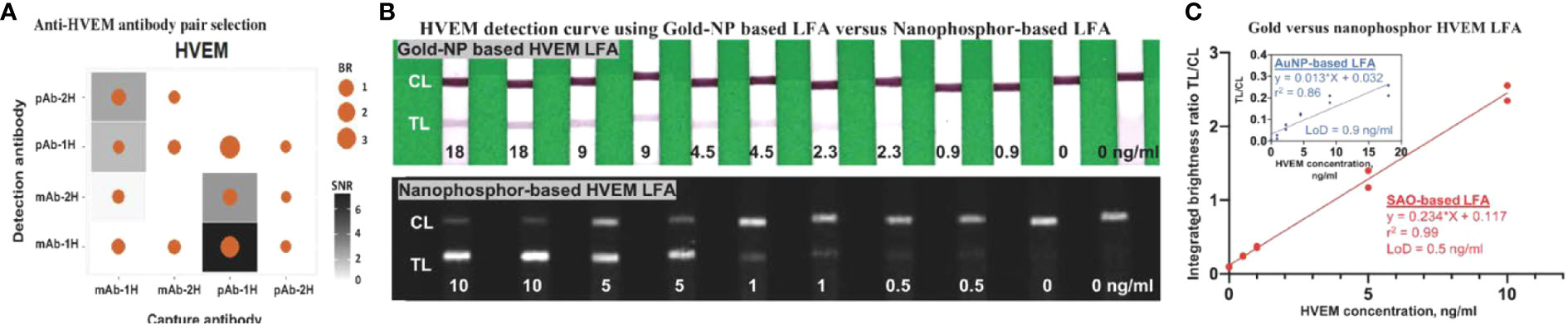 Thirteen pairs of anti-HVEM antibodies were assessed in order to identify pairs with high SNR and TL/CL. Besides SNR and brightness ratio, lower aggregation of functionalized nanoparticles was also considered in choosing the type of antibody to conjugate onto nanoparticles. In total, 13 antibody pairs (four types of antibodies) were tested for anti-HVEM antibody pair selection (Figure 5A), of which capture antibody pAb-1H paired with detection antibody mAb-1H showed the highest SNR and brightness ratio. To compare the performance of nanophosphor-based LFA in HVEM detection to traditional colorimetric colloidal gold nanoparticles (AuNPs), pAb-1H as capture antibody and mAb-1H as detection antibody were utilized for nanophosphor-based LFA and AuNPs-based LFA. Nanophosphors and AuNPs were functionalized separately, and 40 µl running buffer-A1 was used to help the flow of AuNPs and nanophosphors. For both LFAs, standard curves were constructed. Figure 5B demonstrates the correlation between HVEM concentration and integrated brightness ratio using the AuNP- and nanophosphor-based LFA. With nanophosphor-based LFA, the r2 and LoD of HVEM detection were 0.99 and 0.5 ng/ml, respectively. With AuNP-based LFA, the r2 and LoD of HVEM detection were 0.86 and 0.9 ng/ml, respectively. Thus, HVEM detection using a nanophosphor-based LFA outperformed traditional AuNPs-based LFA in linearity (r2) and limit of detection, and were hence used for the rest of the assays.