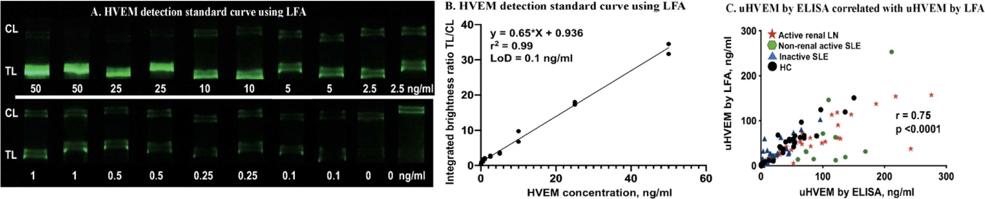 To compare the anti-HVEM LFA against its conventional ELISA counterpart, the same 107 urine samples (healthy control (n=30), inactive lupus (n=29), active non-renal lupus (n=18), active lupus nephritis (n=30)) were measured by newly-fabricated HVEM LFA strips and by commercial HVEM ELISA. Standard curves of HVEM detection in buffer were constructed using HVEM standard (0, 0.1, 0.25, 0.5, 1, 2.5, 5, 10, 25, 50 ng/ml), each measured in duplicates (Figure 6A). The correlation between HVEM concentration and TL/CL is plotted in Figure 6B, and this was used to convert the HVEM LFA TL/CL results to concentration units. A high Pearson correlation was observed between these two assays (r =0.75, p < 0.0001) (Figure 6C).