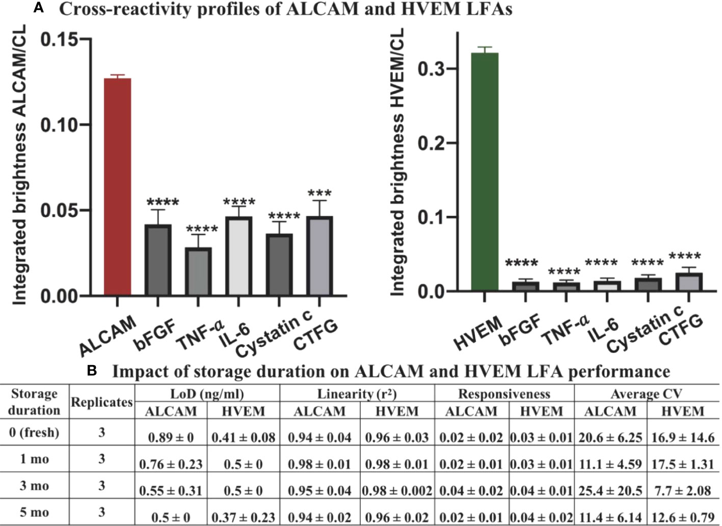 Figure 7 Cross-reactivity and LFA strip stability profiles of ALCAM LFA and HVEM LFA. (A) 1.5 ng/ml of ALCAM or HVEM (positive controls) or bFGF (150 ng/ml), TNF-α (130 pg/ml), IL-6 (120 pg/ml), cystatin c (125 ng/ml), and CTGF (100 ng/ml) were individually spiked to running buffer and assayed using the LFAs. Samples were loaded onto the ALCAM LFA (left) or HVEM LFA (right) in triplicates. ***p < 0.001, ****p < 0.0001 compared to the positive control, as determined using unpaired t-test. (B) The impact of storage duration on strip performance was next tested at room temperature over five months, in triplicate. Three repeats of standard curves were constructed at each storage timepoint. No significant differences (one-way ANOVA) were observed among the groups in terms of LoD, responsiveness, linearity, and average CV. Linearity (r2): goodness-of-fit measure for linear regression model; responsiveness: the slope of the regression model (signal=slope*concentration + intercept); average CV: average of the coefficient of variance across three standard curves at each timepoint.
