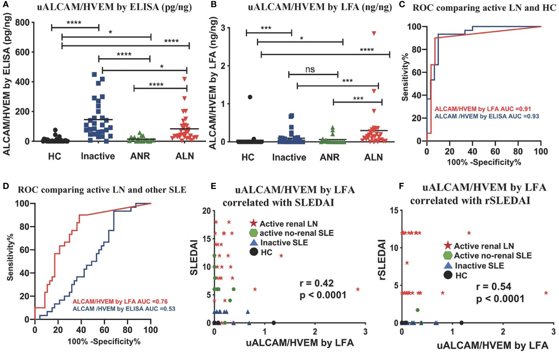 Figure 8 Comparing normalized uALCAM detection using ELISA and LFA in clinical samples. The column graphs show the uHVEM normalized uALCAM levels in four groups of subjects (30 HC, 29 inactive, 18 ANR, and 30 ALN) as assayed by ELISA (A) and LFA (B) The plots show the mean concentration in urine for each disease group. *p < 0.05, ***p < 0.001, ****p < 0.0001 as determined using Mann–Whitney U-test. (C, D) HVEM normalized uALCAM as assayed using the LFAs had the capability to distinguish ALN patients from healthy subjects with high accuracy values (ROC AUC = 0.91) and from all other lupus patients (ROC AUC = 0.76), and were significantly (Spearman) correlated with the disease activity metrics, SLEDAI (E) and rSLEDAI (F). HC, healthy control; inactive, inactive SLE patients; ANR, active non-renal SLE patients; ALN, active renal lupus nephritis patients; (r)SLEDAI, (renal) SLE Disease Activity Index (SLEDAI).