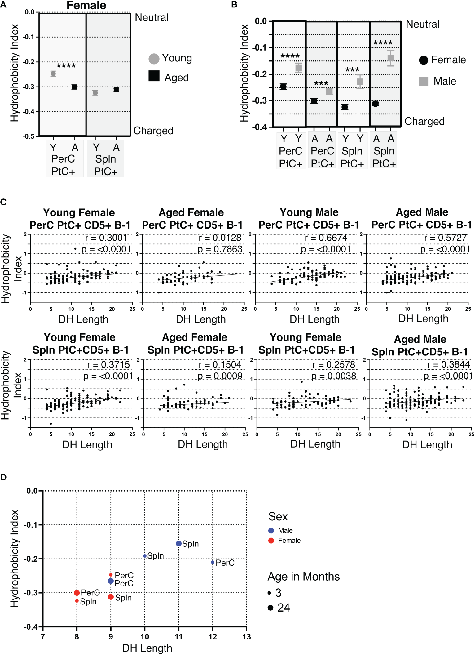 Of the 6 complementary determining regions (CDRs) in antibodies, CDR-H3 is the central point for antigen contact and the most variable in nucleotide/amino acid sequence. Hydrophobicity is a measurable characteristic of the CDR-H3. Hydrophobic CDR-H3 loops have been shown to be important for certain broadly neutralizing antibodies against HIV (43), whereas antibodies with highly charged CDR-H3 loops are often autoreactive (44, 45). We calculated the average hydrophobicity of each CDR-H3 loop using the Kyte-Doolittle scale. Our results demonstrate the CDR-H3 loop of peritoneal (PerC) PtC+CD5+ B-1 cell IgM increases in charge (decreases in hydrophobicity) with age (-0.247 ±0.010 in young vs. -0.300 ±0.009 in aged, p<0.0001) (Figure 5A). Furthermore, females have more highly charged CDR-H3 loops than males in both the PerC and splenic compartments (Figure 5B).