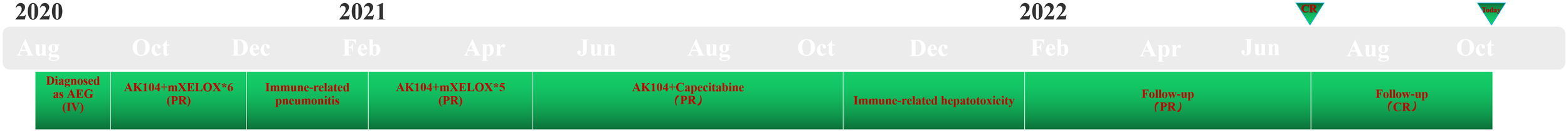 A 42-year-old man was diagnosed with adenocarcinoma of GEJ (stage IV) with liver metastasis and lung metastasis. The patient was enrolled in a trial that excluded patients with known HER2-positivity: AK104, a PD-1/CTLA-4 bispecific antibody, combined with chemotherapy (mXELOX) as first-line therapy for advanced gastric G/GEJ cancer (NCT03852251). After six cycles of AK104 combined with chemotherapy therapy, immune-related pulmonary toxicity was observed. We rechallenged AK104 after hormone therapy, and no further pulmonary toxicity was observed. Immune-related hepatitis occurred in the patient during immunotherapy combined with single-drug capecitabine therapy. After combining steroid therapy with mycophenolate mofetil, the patient’s immune hepatitis improved. Nevertheless, the patient was excluded from the clinical study due to the long-term absence of medication. Antitumor therapy was also discontinued in view of the patient’s adverse immune response. The patient did not receive subsequent immune antitumor therapy, and immune-related hepatitis still occurred intermittently, but the disease evaluation was maintained at PR. A complete response was confirmed by PET/CT and the biopsy specimen from gastroscopy on 2020-06-10. Next generation sequencing of biopsy tissue was used to guide subsequent therapy at a recent follow-up visit. The results indicated that ERBB2 mutations occurred at copy number 58.4934 (HER-2), TMB = 3.1, MSS. IHC: EBV (−), PD-L1 CPS = 3, HER-2 (3+).