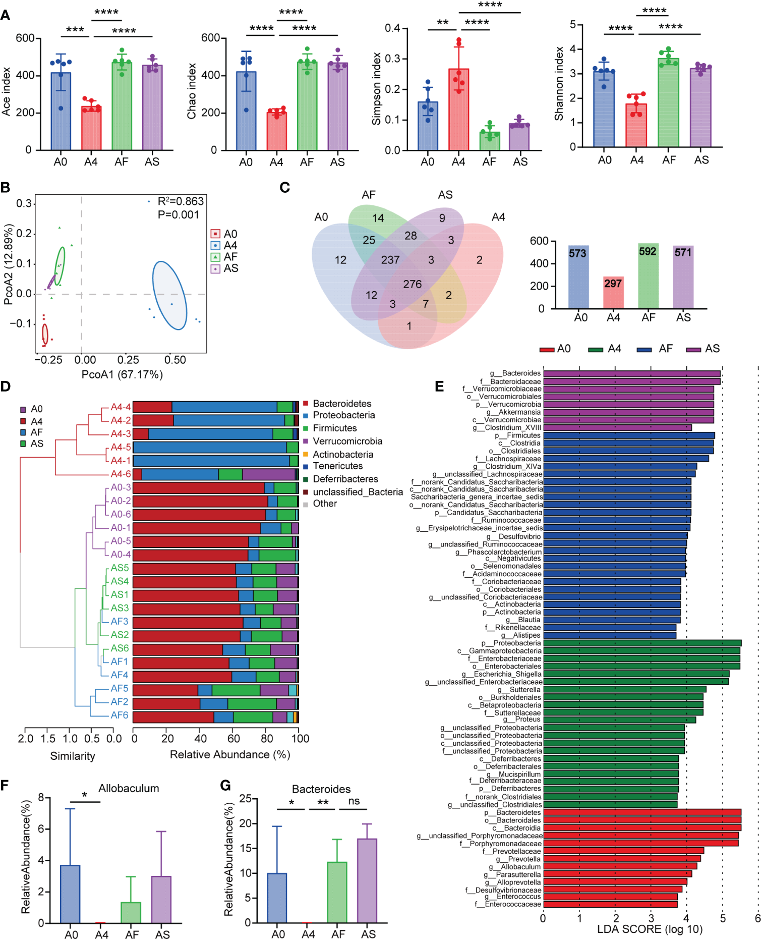 Mouse feces microbiota diversity. (A) Alpha diversity in the A0 (blue), A4 (red), AF (green), and AS (purple) groups, as shown by the Ace, Chao, Shannon, and Simpson indices. (B) The beta diversity of gut microbiota was displayed by principal component analysis (PCoA) scatterplots. (C) Parallel and overlapping circles are seen in this Venn diagram. Species shared between groups are shown by the overlapping portion, while those unique to each group are shown by the non-overlapping portion. (D) Hierarchical clustering based on the Weighted Unifrac Distance of OTU profiles shows the community composition of each sample at the phylum level. (E) At the genus level, the abundance of species in the LEfSe for each group. The gradation of color represents the correlation value. n = 6 mice per group. (F, G) Relative abundance of SCFAs-producing bacteria in groups (F)Allobaculum(G)Bacteroides. A0 group (no antibiotics), A4 group (antibiotics for 4 days + normal saline for 3 days), AF group (antibiotics for 4 days + FMT for 3 days), AS group (antibiotics for 4 days + SCFAs for 3 days). *P < 0.05; **P < 0.01; ***P < 0.001; ****P < 0.0001. ns, not significant.