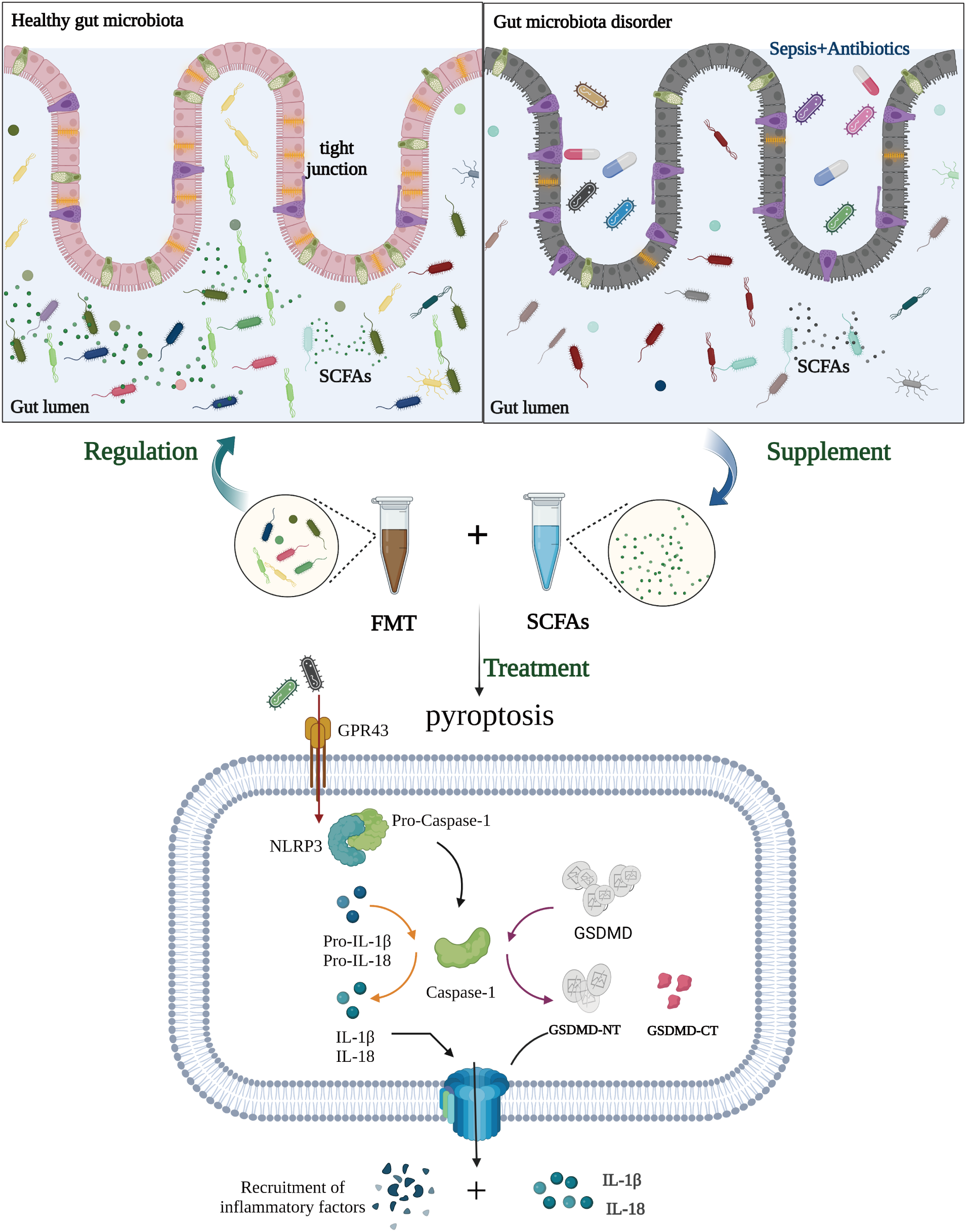 Potential role of fecal microbiota transplantation (FMT) and short-chain fatty acids (SCFAs) in treating sepsis. In the pathogenesis of sepsis, there is an imbalance in the intestinal flora, which decreases the production of SCFAs from intestinal flora metabolites and decreases the ability of SCFAs to bind to GPR43. It also induces further NOD-like receptor protein-3 (NLRP3) inflammasomes to be made and more IL-1β and IL-18 to be released, exacerbating the inflammatory response of tissues and cells. In addition, NLRP3 triggers the activation of caspase-1, which in turn cleaves the gasdermin D (GSDMD) protein and triggers cell pyroptosis, hence exacerbating sepsis and perpetuating the vicious cycle. FMT and SCFAs can protect intestinal function, regulate the distribution and amount of intestinal flora, restore dominant intestinal flora, boost the production of SCFAs, limit inflammatory response and cell pyroptosis, and subsequently protect against sepsis. (Created with BioRender.com).
