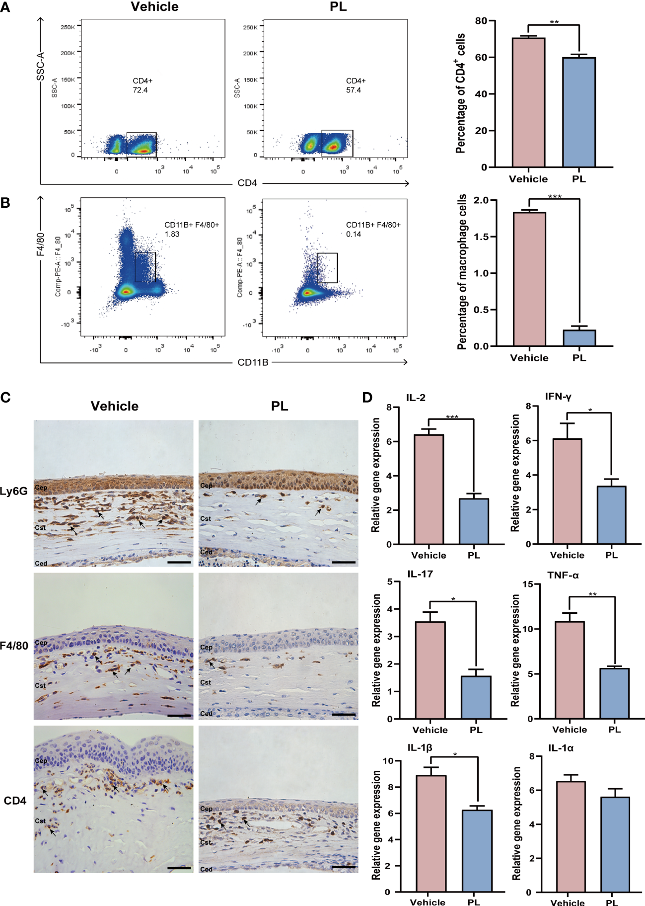 On day 14 after transplantation, the DLNs of recipients were collected, CD4+ T cells and macrophages were sorted by flow cytometry. The result showed that PL treatment significantly decreased the percentage of CD4+ T cells (Figure 3A, 60.10 ± 1.56% vs. 70.70 ± 1.01%, P < 0.01) and macrophages (Figure 3B, 0.22 ± 0.05% vs. 1.84 ± 0.03%, P < 0.001). The in vivo efficacy of PL in reducing inflammatory cell infiltration in corneal tissue was further evaluated by immunohistochemistry. A high density of infiltrated neutrophils, macrophages, and CD4+ cells within the stromal layer of allografts were observed in vehicle-treated mice. However, PL treatment dramatically inhibited the local infiltration of these inflammatory cells mentioned above, as presented in Figure 3C. In parallel, the mRNA levels of major inflammatory factors, including IL-2 (P < 0.001), IFN-γ (P < 0.05), IL-17A (P < 0.05), TNF-α (P < 0.01) and IL-1β (P < 0.05) in PL-treated mice were significantly downregulated compared with vehicle-treated mice (Figure 3D).