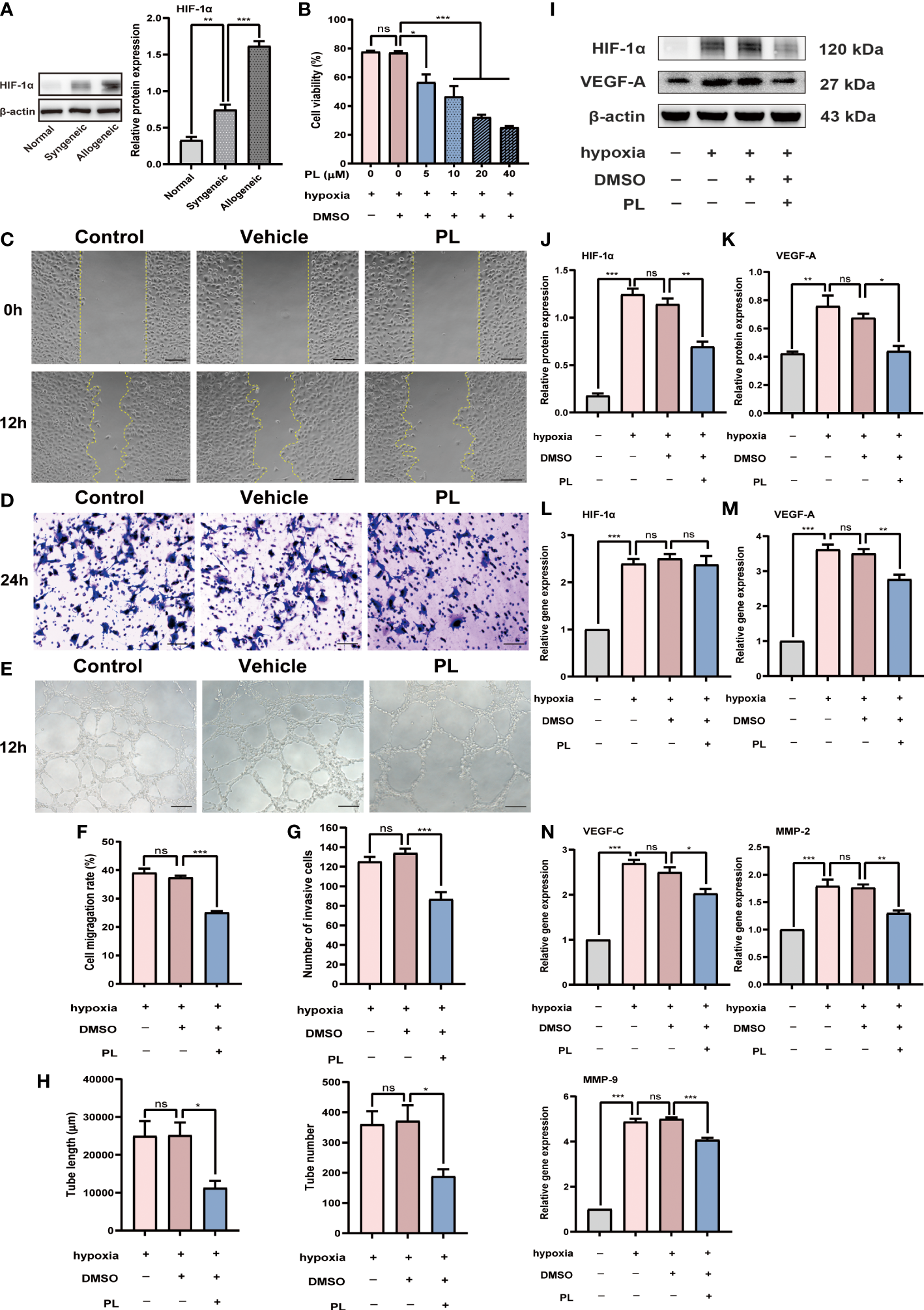 One key pathological feature of cornea allograft rejection is angiogenesis, prominently triggered by hypoxia in other ocular surface disorders. To validate whether there is a hypoxic condition in corneal allograft rejection, we examined the expression of Hif-1α, a generally accepted evaluation indicator for hypoxia. Our result revealed that the protein expression level of HIF-1α was substantially raised in allogeneic mice when compared to syngeneic mice (Figure 4A, P < 0.001). To mimic the hypoxic environment during corneal allograft rejection, a cellular hypoxia model was established in HUVECs and was then used to investigate the role of PL on angiogenesis under hypoxic conditions in vitro. At first, a CCK-8 assay was performed to identify the optimal concentration for PL treatment in vitro. It was found that under hypoxic conditions, 5 μM of PL treatment could significantly inhibit the proliferation of HUVECs by 21%, and such inhibitory effect enlarged as the concentration of PL increased (Figure 4B). Thus, 5 μM of PL treatment was chosen during the following experiments unless otherwise specified. The migration and invasion of HUVECs in response to hypoxia were evaluated by the wound healing and transwell invasion assay. These results revealed that both the migration rate and invasion capacity of HUVECs treated with PL were significantly reduced compared with HUVECs treated with vehicle (Figures 4C, D, F, G, P < 0.001). A pronounced inhibition of the tube formation by PL treatment was noted (Figure 4E), as indicated by a decrease in the tube length and tube number (Figure 4H, both P < 0.05).