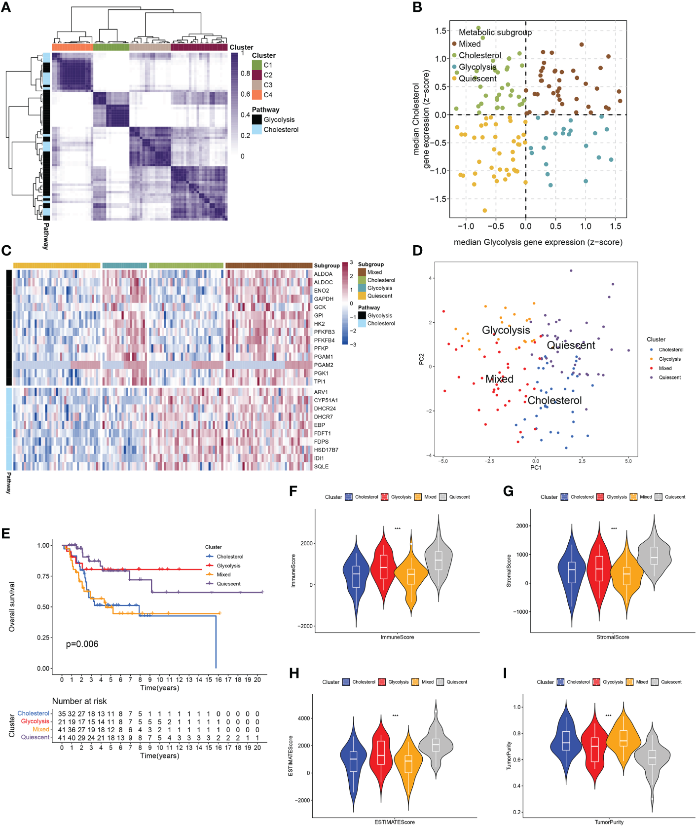 Classification of osteosarcoma patients based on expression of GCSRGs. (A) Heatmap showing consensus clustering solution for GCSRGs in osteosarcoma sample (B) Scatter plot depicting classification of samples based on GCSRGs expression. (C) Heatmap showing expression levels of co-expressed GCSRGs across each subgroup. (D) PCA showing significant differentiation between different subgroups of patients. (E) Kaplan-Meier survival curves of patients in the different subgroups. Log-rank test P values are displayed. (F–I) Violin plots showing the immune score, stromal score, ESTIMATE score and tumor purity across different metabolic subgroups. ***P < 0.001.