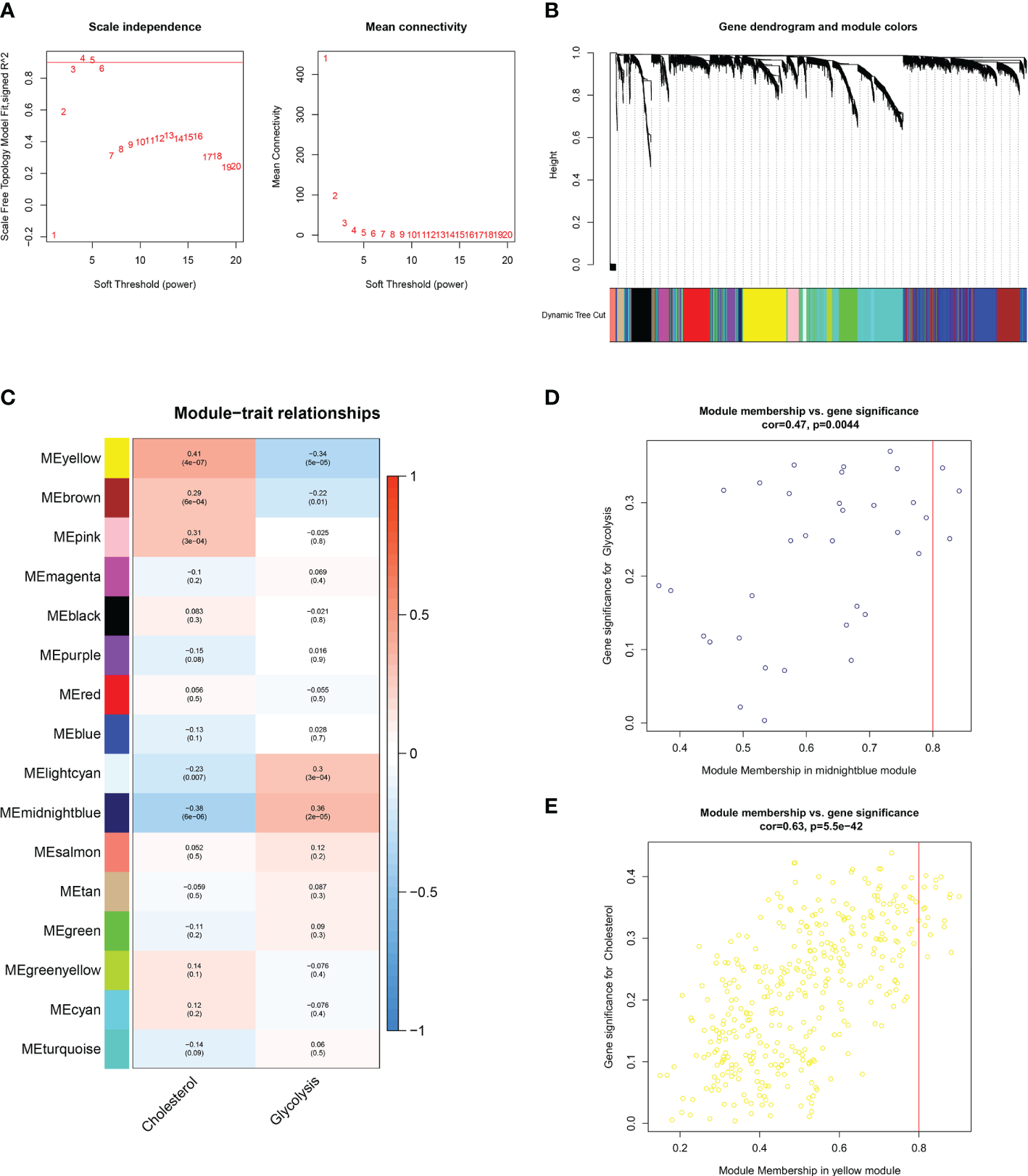 WGCNA to identify similar genes networks of GCSRGs. (A) The scale independence (left) and mean connectivity (right) of WGCNA analysis.(B) Color coding of co-expression network modules for genes. (C) Heatmap showing the correlation of gene modules and glycolysis-cholesterol synthesis. (D) Scatter plot displaying the correlation between module membership and gene significance in midnight blue network. (E) Scatter plot displaying the correlation between module membership and gene significance in yellow network.