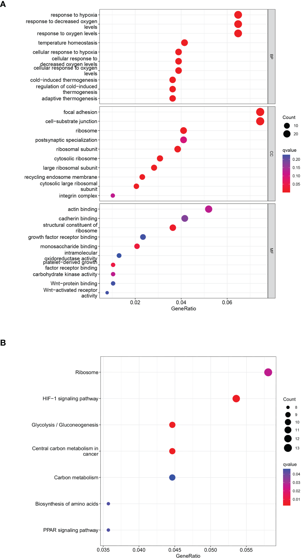 A total of 402 genes within the midnight blue and yellow modules were pooled and used as key metabolic genes. The ClusterProfiler R package was conducted for GO and KEGG pathway enrichment analysis. The bubble plots showed the top 10 in GO-BP, GO-CC, and GO-MF and the top 7 in KEGG. GO functional annotation indicated that GCSRGs were mainly associated with hypoxia response, decreased oxygen response, focal adhesion, cell−substrate junction, ribosome, ribosome structural constituent, and monosaccharide binding (Figure 3A). KEGG functional annotation showed that GCSRGs were mainly associated with pathways including ribosome, HIF-1 signaling pathway, glycolysis/gluconeogenesis, and central carbon metabolism in cancer (Figure 3B).
