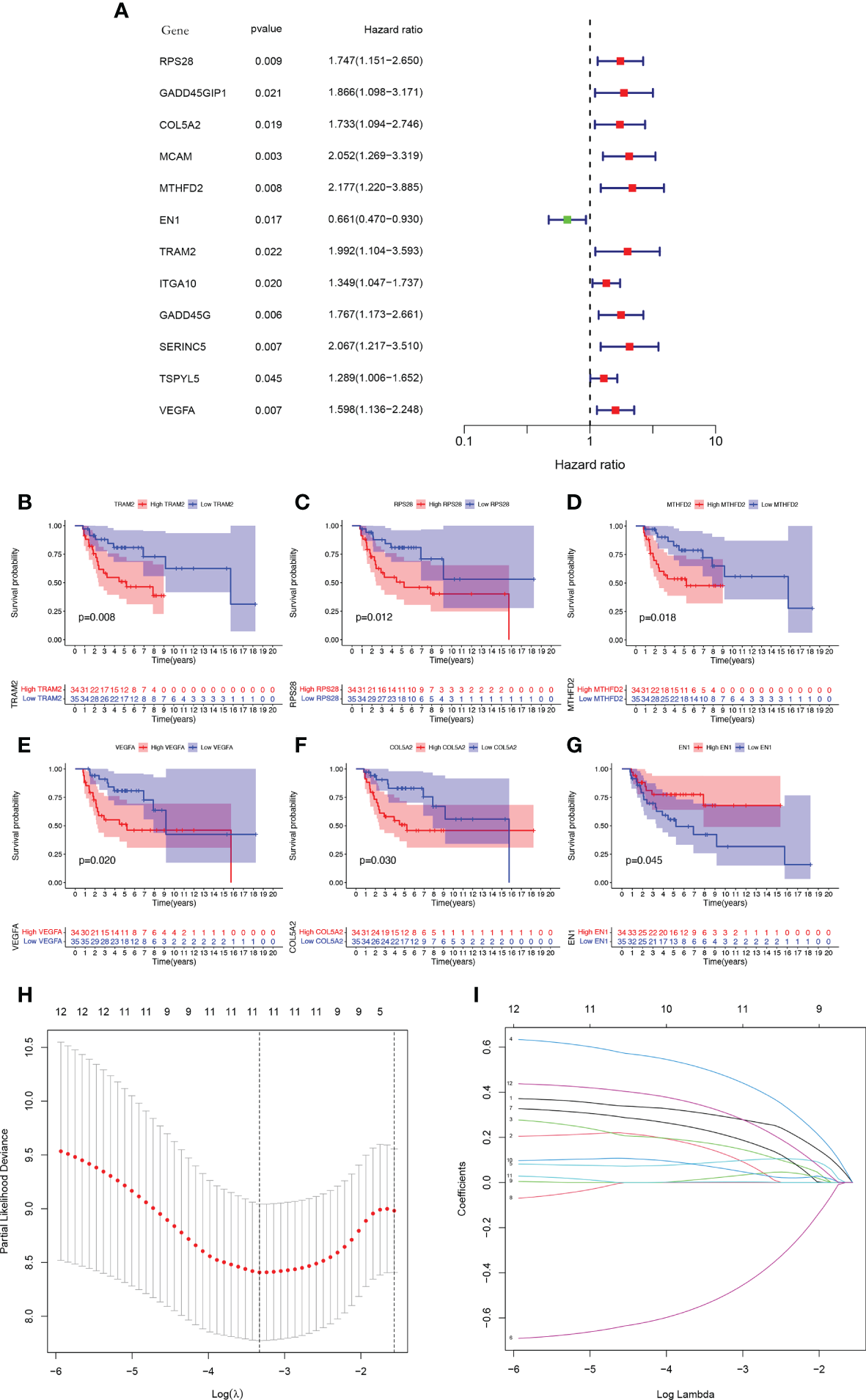 Construction of a GCSRGs prognostic signature in training cohort. (A) Forest plot of univariate cox regression analysis of the survival-related 12 differentially expressed genes. (B–G) Kaplan-Meier survival curves of patients with differential expression of prognosis-related genes. (H) Obtainment of the optimal λ value. (I) The LASSO Cox analysis identified 5 genes associated with prognosis.