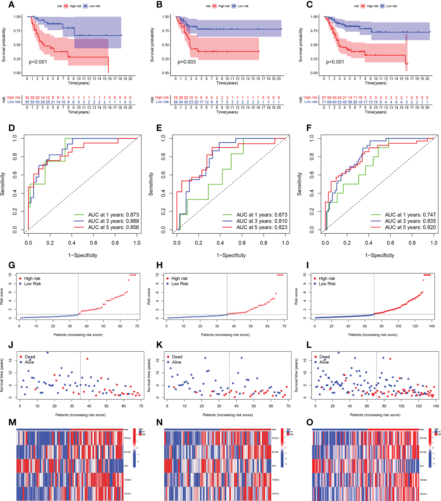 The total cohort was categorized in a random manner into training and verification cohorts. Univariate Cox analysis was carried out on key metabolic genes (genes in the midnight blue and yellow modules) in the training cohort to screen prognosis-related genes via the survival R package, and 12 genes were related to patient prognosis (P < 0.05) (Figure 4A). As Figures 4B–G indicates, the Kaplan-Meier (KM) survival curves of the top 6 genes from low to high in terms of the P value were listed. Then, LASSO Cox regression analysis further reduced dimensionality and constructed genes signature. In the Cox regression based on the LASSO penalty, as log λ changed, the corresponding coefficient of the determined gene also decreased to 0, and in the cross-validation, 12 genes reached the partial likelihood estimation bias minimum value (Figures 4H, I). 5 genes were identified as independent predictors by LASSO Cox regression analysis in training cohort, namely, RPS28, MCAM, EN1, TRAM2, and VEGFA. We determined the risk scores via following formula: Risk score = RPS28 × 0.513 + MCAM × 0.701 - EN1 × 0.718 + TRAM2 × 0.575 + VEGFA × 0.467. The training, verification, and total cohorts were all categorized into high- and low-risk groups based on their median risk score. In each of the three cohorts, it was discovered that the low-risk group’s survival probability was significantly greater than the other group (P < 0.005) (Figures 5A–C). Then, ROC curve analysis evaluated whether the GCSRGs signature is an efficient prognosis predictor of osteosarcoma patients. The 1-, 3-, and 5-year AUC predicted by the genes signature in training cohort were, 0.873, 0.889, and 0.856, respectively; in verification cohort, were 0.673, 0.810, and 0.823, respectively; in total cohort, were 0.747, 0.835, and 0.820, respectively (Figures 5D–F). In the low-risk group, the expression of 4 high-risk genes (RPS28, MCAM, TRAM2, and VEGFA) was low, while the low-risk gene EN1 expression was high (Figures 5G–I). Finally, we compared the survival status between the two groups in the three cohorts (Figures 5J–L) and plotted an expression heatmap of the risk genes (Figures 5M–O).